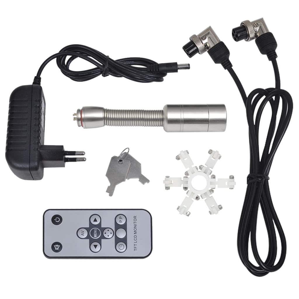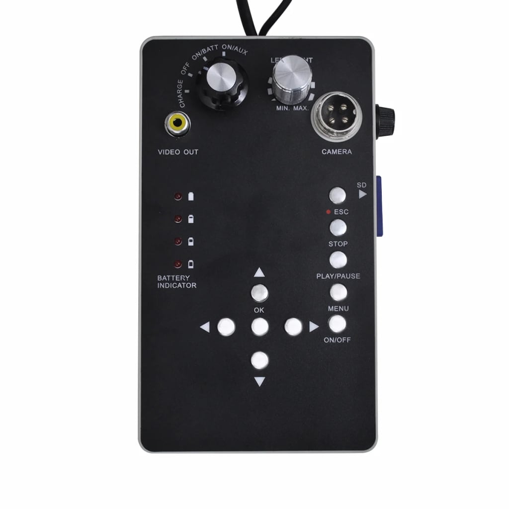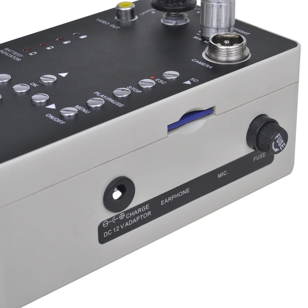 Es handelt sich um ein professionelles Videokamera-System mit einer wasserdichten Kamera, die über ein Glasfaserkabel verbunden ist und für die Inspektion von Abwasserrohren und anderen schwer zugänglichen Stellen verwendet wird. Wenn die Rohrkamera an die Kabeltrommel angeschlossen wird, kann die gewünschte Tiefe oder Entfernung durch Abrollen des Kabels erreicht werden. Die angebrachte Rollenführung schützt die Inspektionskamera vor ernsthaften Beschädigungen und sorgt für eine reibungslose Bewegung der Kamera. Das Bild wird auf dem Farbmonitor mit Menütaste/Fernbedienung angezeigt, mit der du das Bild und die Ansicht einstellen kannst. Die Kamera verfügt außerdem über integrierte LEDs, die eine Inspektion in völliger Dunkelheit ermöglichen. Außerdem kann man mit der DVR-Kontrollbox Video- oder Tonaufnahmen machen und die Bilder/Videos auf einen PC übertragen. Der helle Farbmonitor verfügt außerdem über eine Sonnenblende, die eine bessere Sicht mit weniger Reflexionen gewährleistet. Das Gerät lässt sich in dem mitgelieferten Koffer leicht transportieren.