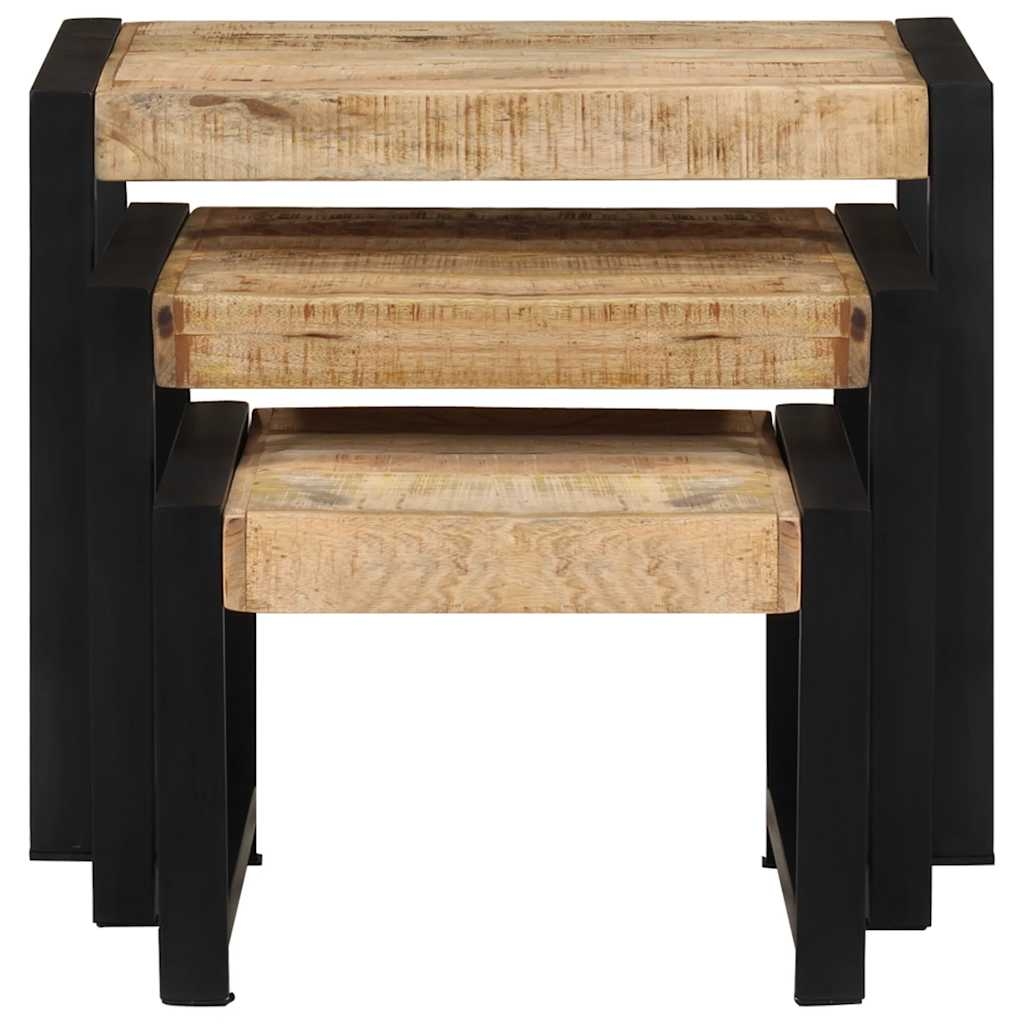 Diese Mangoholz-Tische sind sowohl stilvoll als auch praktisch und werden bestimmt zum Hingucker in Ihrem Zuhause. Dieses Set aus 3 Satztischen im Vintage-Stil besteht aus massivem Mangoholz und ist dadurch sehr stabil und langlebig. Mangoholz ist ein dichtes und robustes Hartholz mit schönen braunen oder goldenen Streifen und Konturen auf seiner Oberfläche. Dank des verstärkten Stahlrahmens sind die Tische sehr stabil und langlebig. Da diese Tische ineinander stapelbar sind, sparen sie viel Platz, wenn sie einmal nicht gebraucht werden. Die Handwerkskunst verleiht diesen Tischen einen spektakulären Retro-Stil. Jeder Schritt des Fertigungsprozesses wird mit größter Sorgfalt durchgeführt, sei es beim Polieren, Anstreichen oder Lackieren. Wichtige Anmerkung: Farben können von Produkt zu Produkt variieren, jeder Tisch wird somit einzigartig; die Lieferung erfolgt zufällig.