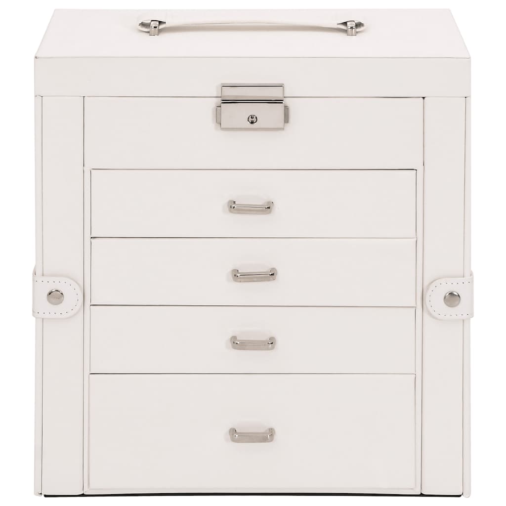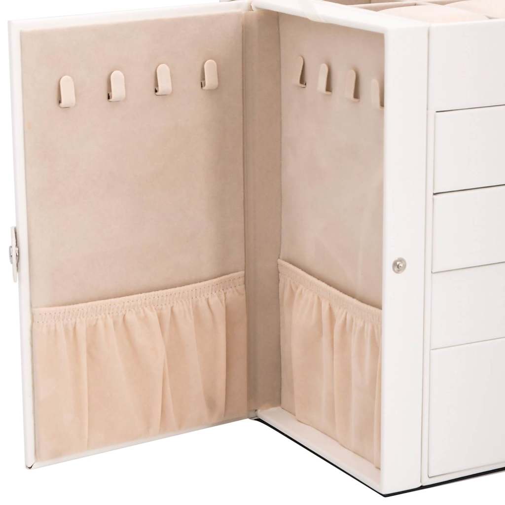Organisiere deine Schmuckkollektion ganz einfach mit dem 5-schichtigen Schmuckkästchen, das Eleganz und Praktikabilität vereint. Reichlich Stauraum: Der Schmuckkasten verfügt über fünf Schichten mit mehreren Fächern für eine mühelose Organisation. Die oberste bis zur zweiten Schicht enthält spezielle Ringhalter und Fächer für Armbänder und Ohrringe. Seitenteile mit Haken und Taschen ermöglichen dir einen einfachen Zugriff auf Ohrstecker und Halsketten, sodass deine Schmuckkollektion ordentlich und jederzeit griffbereit bleibt.Weiches Samtfutter: Das Innere der Schmuckschatulle ist mit Samt ausgekleidet, der eine weiche, elegante Note vermittelt. Dieses zarte Futter schützt deinen wertvollen Schmuck nicht nur vor Kratzern, sondern hebt auch die gesamte Ästhetik hervor und schafft einen eleganten Raum für deine wertvollen Stücke.Praktisches Design: Der eingebaute Spiegel bietet dir zusätzlichen Komfort beim Schminken oder Überprüfen deines Aussehens, während ein Stoffband den Deckel mit dem Kasten verbindet und ein reibungsloses Öffnen und Schließen gewährleistet. Außerdem ermöglicht dir der herausnehmbare Trenner in der oberen Schicht, den Stauraum individuell an deinen Schmuck anzupassen.Sichere Aufbewahrung: Diese Schmuckschatulle verfügt über eine abschließbare obere Schicht, die zusätzliche Sicherheit für kostbare Stücke bietet. Ausgestattet mit passenden Schlüsseln sind die Wertsachen sicher aufbewahrt und geschützt.Vielseitig einsetzbar: Dieser Schmuckkasten ist ideal für den persönlichen Gebrauch oder als durchdachtes Geschenk. Er passt zu verschiedenen Stilen und Anlässen und spricht sowohl Gelegenheits- als auch anspruchsvolle Schmuckliebhaber an. Gut zu wissen:Nur die oberste Schicht ist abschließbar.