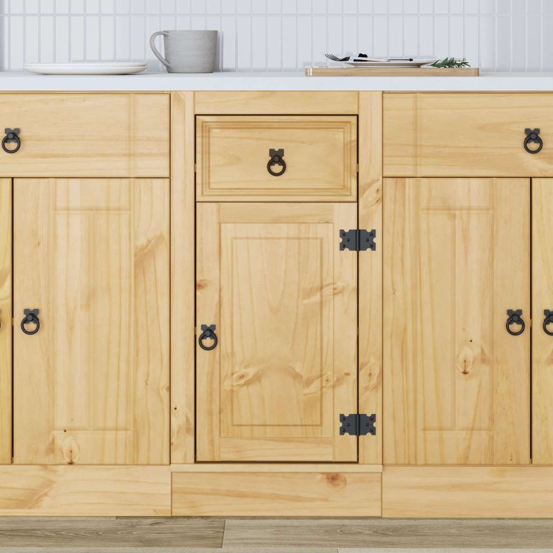 Der moderne Schrank ist so gestaltet, dass er die stilvolle Funktionalität deines Wohn- oder Esszimmers aufwertet. Wenn du Wert auf einen klaren, eleganten Stil legst und gleichzeitig praktische Lösungen suchst, ist dieser Schrank genau richtig für dich. Die rechteckige Form und sauberen Linien fügen sich perfekt in jeden Raum ein, während er ausreichend Platz für deine Wohn- und Essgegenstände bietet. Das ansprechende Kiefernholz und der schlanke Look machen ihn zu einer großartigen Ergänzung, die sich verschiedenen Einrichtungsstilen anpasst. Er bringt eine beeindruckende visuelle Präsenz mit, die die Schönheit deines Zuhauses hervorhebt und dabei nützlich bleibt. Massivholz Kiefer Konstruktion Dieser Schrank ist aus robustem Kiefernholz gefertigt, das für Langlebigkeit und Haltbarkeit sorgt. Diese Materialwahl unterstützt nicht nur eine stabilere Struktur, sondern verleiht dem Möbelstück auch eine elegante natürliche Ausstrahlung. Massivholz Kiefer ist bekannt für seine Stärke und bietet die perfekte Basis für alle Aufbewahrungslösungen. Elegante rechteckige Form Der Schrank hat ein modernes Design, das sich perfekt in die zeitgenössische Einrichtung einfügt. Sein schlanker Look ermöglicht es ihm, nahtlos mit anderem Mobiliar zu harmonieren und bietet ausreichend Platz für deine organisatorischen Bedürfnisse. Das zurückhaltende Design sorgt dafür, dass er stilvoll ist, ohne sich aufzudrängen. Reichlich Stauraum Dieser Schrank wurde mit dem Fokus auf Praktikabilität entwickelt und bietet viele Möglichkeiten zur Aufbewahrung. Er nutzt den Platz optimal mit einer durchdachten Anordnung für all deine Gegenstände, von Geschirr bis Deko. Damit behältst du den Überblick und schaffst Platz für ein aufgeräumtes Zuhause. Moderne Gestaltung Die klaren Linien und reduzierten Verzierungen sorgen dafür, dass der Schrank sowohl in modernen als auch in traditionellen Umgebungen super aussieht. Er ergänzt minimalistisches Design und sorgt für eine harmonische Atmosphäre in deinem Zuhause. Dieses Möbelstück passt perfekt zu Trends in der Inneneinrichtung. Sicherheitsmerkmale Um die Sicherheit zu gewährleisten, solltest du diesen Schrank an der Wand befestigen, damit er nicht umfallen kann. Dieser wichtige Schritt sorgt dafür, dass das Möbelstück stabil bleibt und minimiert das Risiko von Unfällen. Dadurch trägst du zu einem sicheren Wohnraum bei und erhältst gleichzeitig das ansprechende Design des Schranks.
