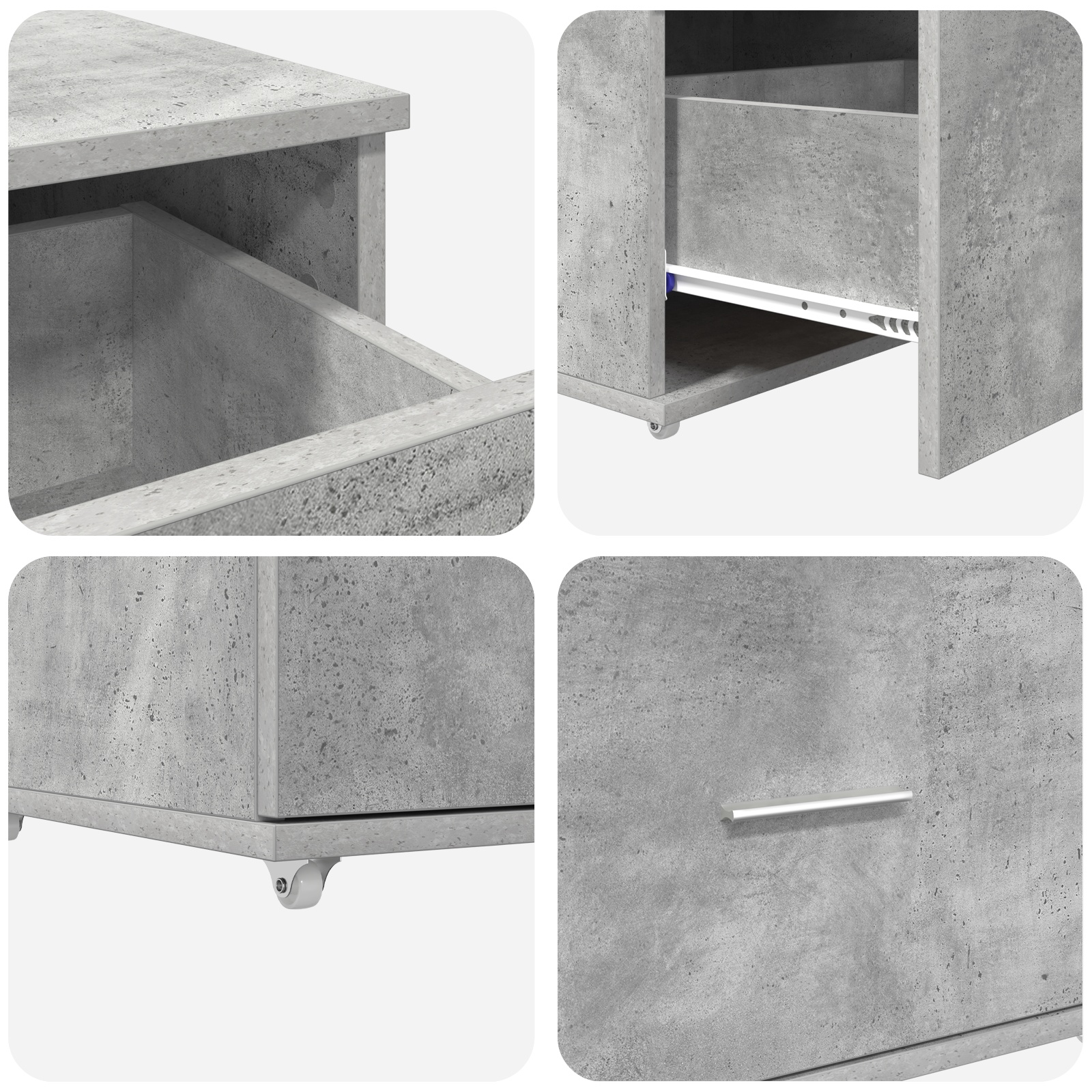 Dieser Schubladenschrank hat einen industriellen Look, der perfekt in jedes Büro oder Wohnzimmer passt und tollen Stauraum bietet. Gemacht aus robustem MDF mit einer Beton grau Oberfläche, sorgt das glatte Gefühl für einfache Eleganz, sieht schick aus und macht seinen Job gut. Viel Stauraum: Mit viel Platz innen macht dieser Schrank es einfach, Dokumente, Kleinteile und Zubehör zu organisieren und einen aufgeräumten Raum für Produktivität und Entspannung zu schaffen. Bewegliches Design: Ausgestattet mit vier sanft rollenden Rädern kannst du diesen Schrank spielend leicht bewegen, was ihn perfekt für Räume macht, in denen du gerne mal umstellst. Industrieller Stil: Das schlichte Design und die matte Beton grau Oberfläche machen diesen Schrank zu einer tollen Wahl für moderne Looks und passen sich nahtlos verschiedenen Einrichtungsstilen an. Haltbares Material: Aus MDF gefertigt, ist dieser Schrank robust genug, um den täglichen Gebrauch zu überstehen und bleibt somit über Jahre ein zuverlässiges Möbelstück. Effizienz in der Organisation: Die klassische Schubladeneinteilung erleichtert den Zugriff auf deine Sachen, was dir hilft, organisiert zu bleiben und alles ohne Probleme zu finden.