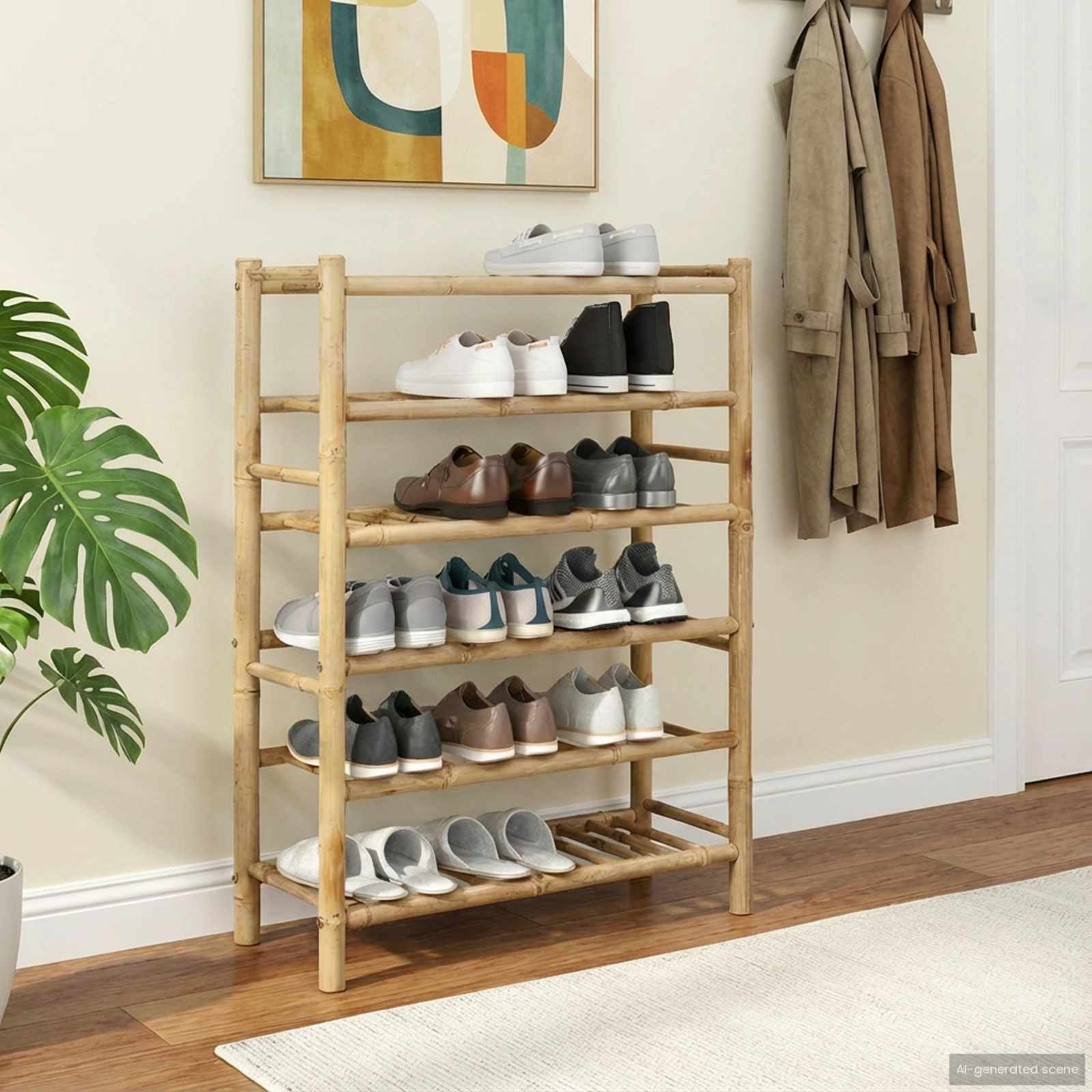 Dieses Schuhregal ist ideal, um deine Schuhe zu organisieren. Es kombiniert Nutzen und Stil perfekt und passt in moderne Haushalte. Die rechteckige Form und die natürliche Farbe machen es zu einer schönen Ergänzung für jeden Flur und bringen Ordnung ins Schuhchaos. Das klare Design sieht super aus und passt in jede Umgebung. Bambusbau Der Bambus in diesem Schuhregal ist nachhaltig und stabil. So hält es dem täglichen Gebrauch stand und ist eine umweltfreundliche Wahl für alle, die Wert auf die Umwelt legen. Praktische Organisation Die Konstruktion des Regals fördert eine einfache Organisation, sodass du all deine Schuhe an einem zentralen und leicht erreichbaren Ort aufbewahren kannst. Stylisches Dekorationsstück Neben der Funktionalität ist das Regal durch sein natürliches Design ein echtes Highlight, das deinen Flur aufwertet. Effiziente Montage Der Aufbau ist einfach und erfordert nur einen Schraubendreher. Anpassungsfähig für die Jahreszeiten In den Frühjahrs- und Sommermonaten kommt die robuste Bauweise besonders gut zur Geltung, da sie alle Schuharten trägt.