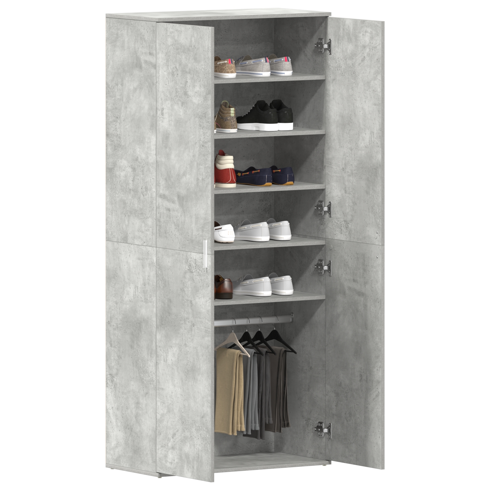 Dieser Schuhschrank ist eine smarte Aufbewahrungslösung, die deinen Raum aufpeppt und gleichzeitig deine Schuhe und Klamotten sortiert. Das Beton grau Finish verleiht einen industriellen Touch, der super in alle möglichen Innenräume passt und ihn zur idealen Wahl für Schlafzimmer und Flure macht. Reichlich Stauraum: Mit vier Regalen und zwei Türen bietet dieser Schrank genug Platz für deine Schuhe und Klamotten und hält alles ordentlich. Langlebige Konstruktion: Hergestellt aus Spanplatte, ist dieser Schuhschrank robust und hält dem täglichen Verschleiß stand, während er schick bleibt. Du kannst dir sicher sein, dass er deine Sachen sicher hält. Vielseitiger Stil: Sein modernes Design und die strukturierte Oberfläche werten jeden Raum auf. Ob im Schlafzimmer oder Flur, er fügt deinem Zuhause einen eleganten Touch hinzu. Einfache Pflege: Ein schnelles Wischen mit einem feuchten Tuch genügt, um den Schrank frisch aussehen zu lassen. Er ist stabil, vergiss nur nicht, ihn mit der beiliegenden Wandbefestigung zu sichern, damit er nicht umkippt. Einfache Montage: Kommt mit klaren Anweisungen und benötigt zwei Personen, einen Bohrer und einen Schraubendreher—es ist leicht für alle, selbst wenn du kein DIY-Profi bist.