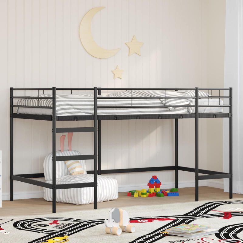 Das Kinder-Loftbett ist die ideale Kombination aus Stil und Praktikabilität fürs Kinderzimmer. Es hat klare Linien und kommt ohne unnötigen Schnickschnack aus. Die elegante, pulverbeschichtete Metallkonstruktion sorgt für einen stabilen Schlafplatz, während das kompakte Design eine smarte Möglichkeit zum Platzsparen bietet. Perfekt für kleine Abenteurer, bietet dieses Loftbett eine gemütliche Schlafstätte über einem geräumigen Bereich, den man als Arbeitsplatz oder Spielecke nutzen kann. Mit seiner glatten, matten Oberfläche schafft es eine coole Atmosphäre und wertet jedes Zimmer auf. Metallkonstruktion: Der Bettrahmen aus Metall sorgt für Stärke und Stabilität. Die pulverbeschichtete Oberfläche sieht nicht nur gut aus, sondern schützt auch vor Kratzern und Abnutzungen und garantiert hohe Langlebigkeit selbst in lebhaften Kinderzimmern. Platzersparnis: Das Loftbett nutzt den vertikalen Raum optimal und schafft viel Platz darunter. Ideal für kleine Schlafzimmer, bleibt der Boden frei für zusätzliche Möbel oder einen Spielbereich, ohne den Schlafkomfort zu beeinträchtigen. Sicher und stabil: Mit einem robusten Lattenrahmen aus stabilem Metall bietet das Etagenbett Sicherheit und Stabilität. Feste Rahmen sind zwar kostengünstig, bieten aber nur begrenzte Flexibilität und sind perfekt, um die Struktur bei aktivem Gebrauch zu wahren. Moderner Stil: Das schlichte, mattschwarze Design fügt sich nahtlos in moderne Dekore ein. Es fühlt sich angenehm an und hat eine rechteckige Form, die einen zeitgenössischen, minimalistischen Stil bringt, der zu jedem Schlafzimmer passt. Pflege und Wartung: Der Pflegeaufwand ist gering, da der Rahmen sich mit einem feuchten Tuch einfach reinigen lässt, um seine Eleganz zu bewahren. Vermeide es, schwere Gegenstände über die Oberfläche zu ziehen, um das feine Finish zu erhalten und sicherzustellen, dass es ein fester Bestandteil im Kinderzimmer bleibt.