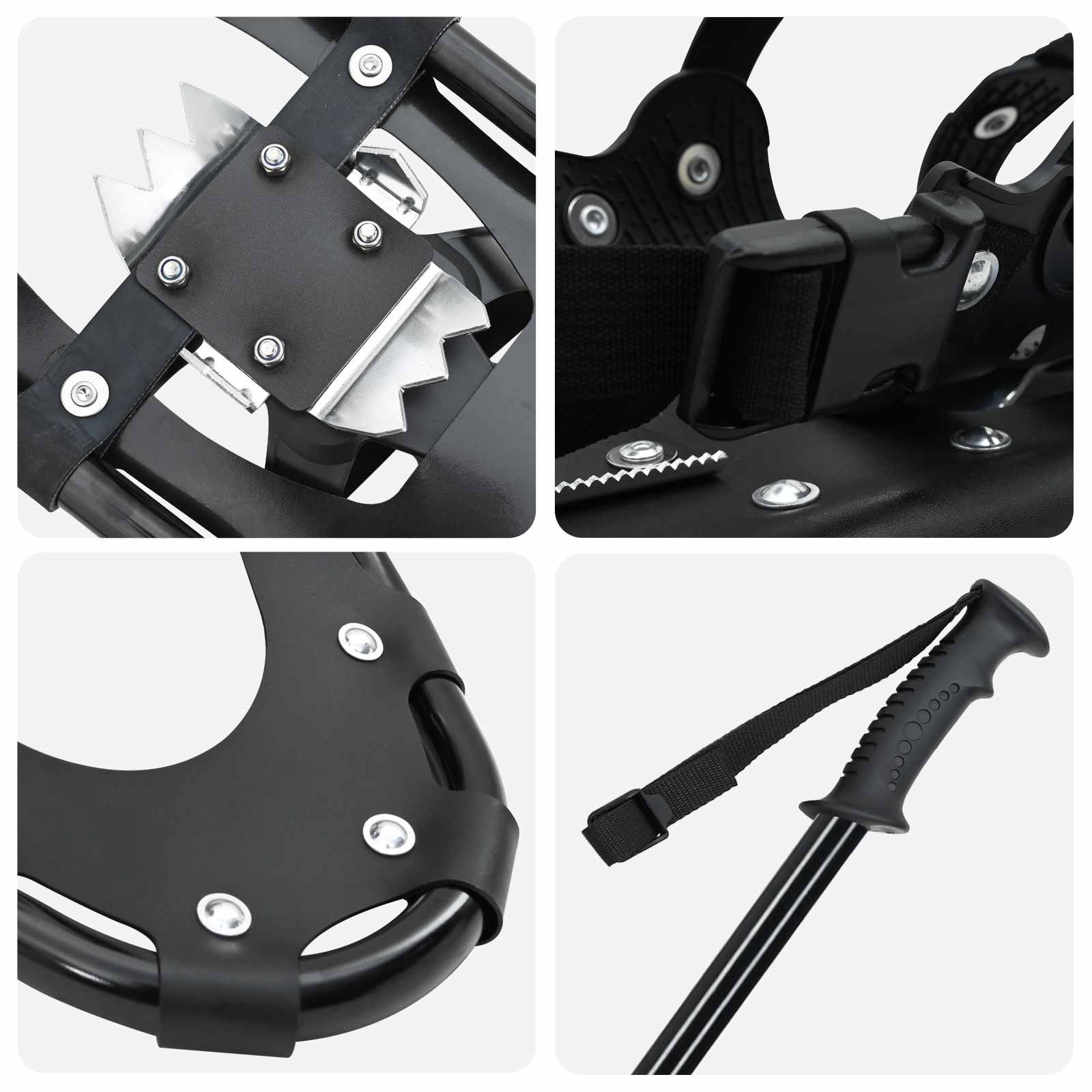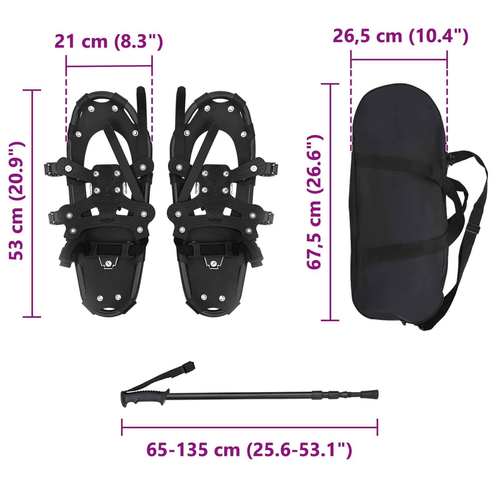 Dieses 3 IN 1 moderne Schneeschuhset mit Wanderstöcken ist perfekt für alle, die den Winter und Abenteuer im Schnee lieben. Es steht für einfache Handhabung und Funktionalität und verspricht ein leichtes Gleiten über schneebedeckte Wege, ideal für Outdoor-Fans. Durch sein modernes Design spricht es sowohl Anfänger als auch erfahrene Schneeschuhwanderer an, die nach Freiheit und Aufregung suchen. Aluminiumrahmen & Polyethylenboden: Robust und langlebig, hält der Aluminiumrahmen auch rauen Bedingungen stand. Die Kältebeständigkeit sorgt dafür, dass du sicher durch den Schnee kommst. Komplettset: Enthält ein Paar Schneeschuhe, zwei verstellbare Wanderstöcke und eine Tragetasche. Ideal für jeden, der alles für sein Schneewander-Abenteuer in einem Paket sucht. Alles ist leicht zu transportieren und zu lagern, damit du immer für Abenteuer gewappnet bist. Kältebeständige Eigenschaften: Der HDPE-Boden ist perfekt für kalte Umgebungen, und der verstellbare Fersenriemen sorgt dafür, dass deine Füße gut sitzen. So bleibst du auf jedem Terrain sicher und kontrolliert. Vielseitige Nutzung: Ob beim Wandern auf den Bergen oder in versteckten Wäldern, die Schneeschuhe passen von Größe 38 bis 48 und das Ratschen-System bietet eine flexible Anpassung für verschiedene Nutzer. Einfache Pflege: Bewahre die Ausrüstung an einem kühlen, trockenen Ort auf und wische sie mit einem trockenen Tuch ab, um sie in Top-Zustand zu halten. Vermeide den Gebrauch auf Asphalt, um den Boden zu schonen, und überprüfe sie vor jeder Wintersaison.