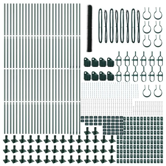 - Lieferumfang: Zaunpfosten, Schienen, Befestigungsclips, grünes Zaunnetz