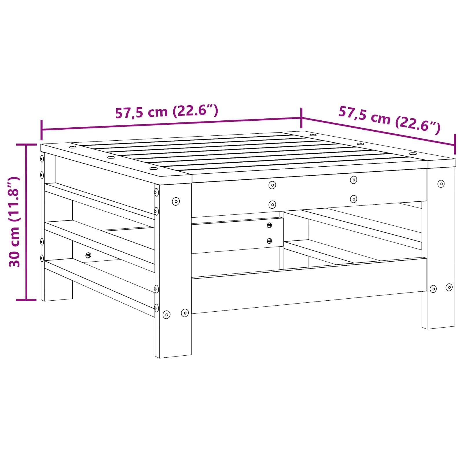 - Gesamtabmessungen: 57,5 x 57,5 x 30 cm (L x B x H)