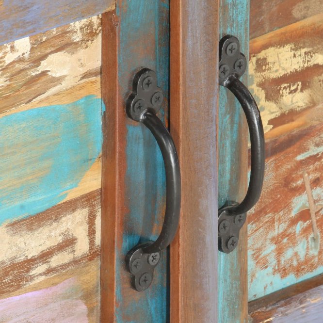 Dieser Beistellschrank im Antikstil verfügt über ein geräumiges Fach mit 2 Türen und 2 Schubladen und bietet Ihnen ausreichenden Stauraum, um Ihre Sachen ordentlich aufzubewahren. Auf der robusten Obersplatte können Sie Ihren Computer, Ihr Tablet, Bücher, Vasen oder Dekoartikel aufstellen. Dieser Schrank aus recyceltem Massivholz ist eine gute Wahl, egal ob Sie ihn im Wohnzimmer oder Schlafzimmer einsetzen. Er kann auch als Beistelltisch, Anrichte, Konsolentisch, usw. verwendet werden. Dieser Holzschrank ist aus Altholz gefertigt, wodurch jedes Möbelstück einzigartig und ein unverwechselbares Unikat ist. Möbelstücke aus wiederverwertetem Altholz verfügen über die Eigenschaften der verschiedenen Holzarten aus denen sie zusammengesetzt sind, wie Teak-, Akazien-, Mangoholz, usw. Altholz ist massiv, stabil, langlebig und ästhetisch schön. Kleine Unvollkommenheiten am Holz, wie z.B. Nagellöcher oder Abnutzungen erzählen die Geschichte des Holzes und verleihen dem Möbelstück seinen eigenen Charakter. Der Schrank ist komplett handgefertigt, wobei ihm die Handwerkskunst einen eindrucksvollen Retro-Stil verleiht. Jeder Schritt des Fertigungsprozesses, ob Polierung, Bemalung oder Lackierung, wurde mit größter Sorgfalt ausgeführt. Bitte beachten Sie: Farben können von Produkt zu Produkt variieren, jede Anrichte wird somit einzigartig; die Lieferung erfolgt zufällig.