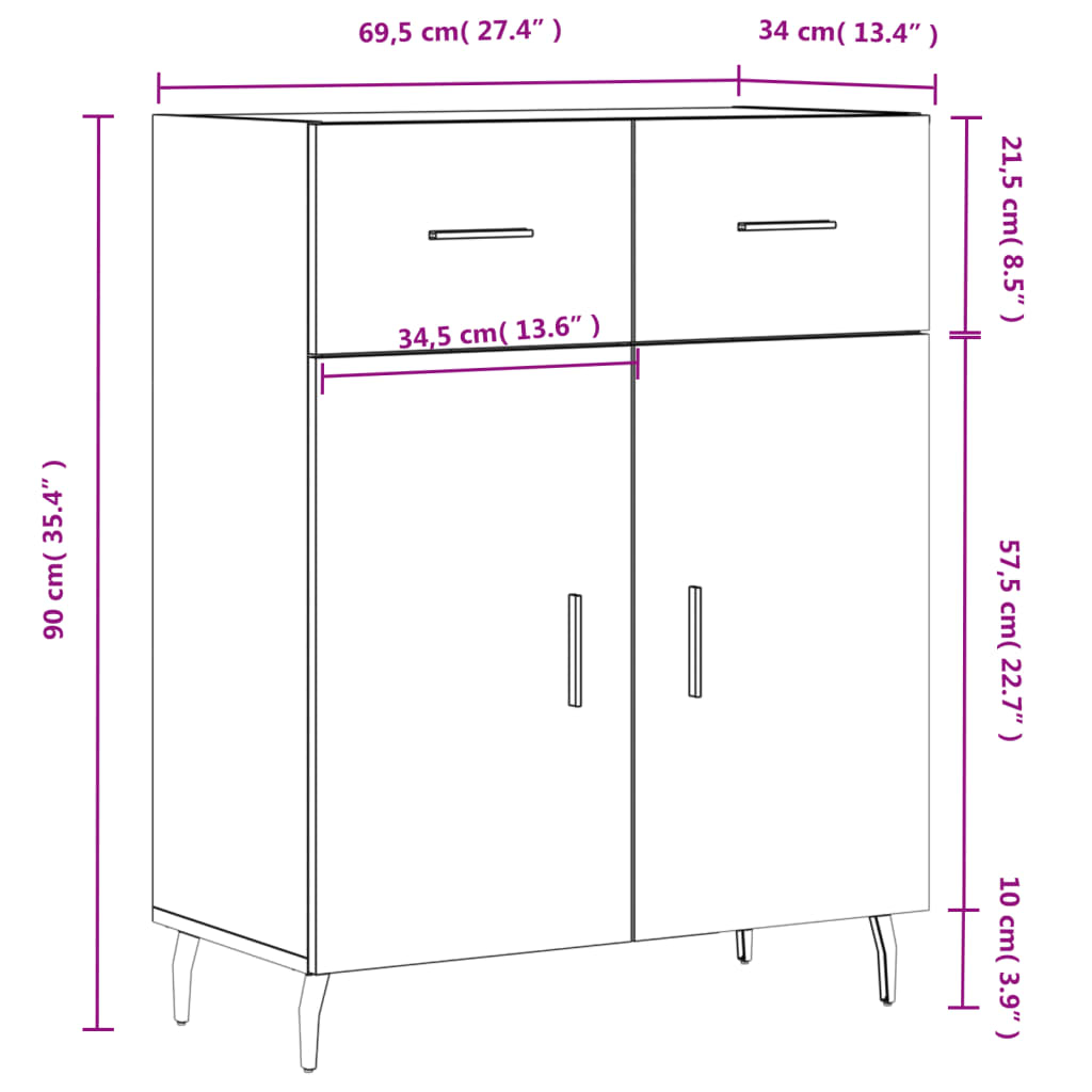 Dieses moderne Sideboard im zeitlosen Look ist eine hervorragende Ergänzung für dein Zuhause. Langlebiges Material: Holzwerkstoff ist ein Material von außergewöhnlicher Qualität mit glatter Oberfläche, das sich durch Festigkeit, Stabilität und Feuchtigkeitsbeständigkeit auszeichnet. Metallbeine: Die Metallbeine verleihen Ihrem Interieur eine moderne und angenehme Note und sorgen gleichzeitig für Stabilität. Viel Stauraum: Das Sideboard bietet viel Platz, um verschiedene Alltagssachen gut organisiert und in Reichweite aufzubewahren.Stabile und robuste Platte: Die Oberplatte dieses Schranks eignet sich perfekt zum Präsentieren von Dekorationsgegenständen, Bilderrahmen und Topfpflanzen. Praktische Türen: Halte deine wichtigsten Sachen staubfrei, indem du sie hinter den Türen verstaust. Darüber hinaus erleichtern die Griffe an den Türen und Schubladen das Öffnen. Achtung:Um ein Umkippen zu vermeiden, sollte dieses Produkt mit der mitgelieferten Wandhalterung gesichert werden.