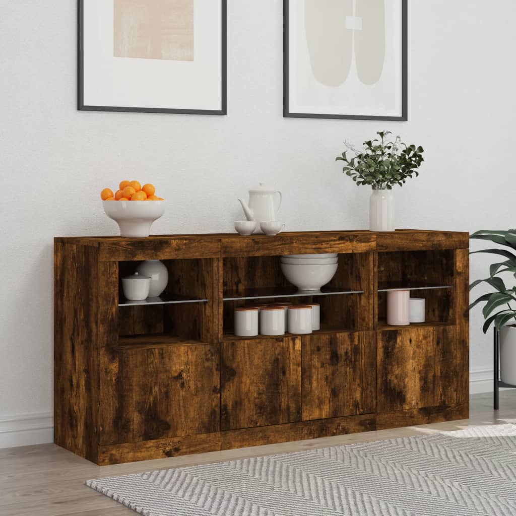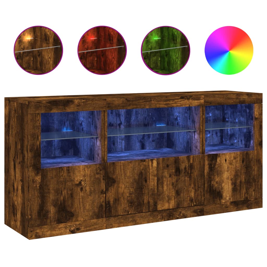Dekoriere deinen Raum mit diesem modernen Sideboard mit LED-Leuchten, das sich leicht mit Möbeln in jedem Stil in deinem Zuhause kombinieren lässt. Langlebiges Material: Holzwerkstoff ist ein Material von außergewöhnlicher Qualität mit glatter Oberfläche, das sich durch Festigkeit, Stabilität und Feuchtigkeitsbeständigkeit auszeichnet.RGB-LED-Leuchten: Die Anrichte ist mit lebendigen RGB-LED-Leuchten ausgestattet. Mit verschiedenen anpassbaren Menüs kannst du die Farbe der Lichter mühelos wechseln und sie sogar auf automatische Anpassung einstellen. Die LED-Beleuchtung unterstreicht den modernen Look des Sideboards und trägt zu seinem trendigen Design bei.Viel Stauraum: Der Beistellschrank bietet viel Stauraum, um verschiedene Alltagssachen ordentlich und griffbereit aufzubewahren.Präsentation: Die stabile Oberplatte des Flurschranks eignet sich ideal, um Dekoartikel, Bilderrahmen oder Topfpflanzen zur Schau zu stellen.Praktische Türen: Schütze deine wichtigsten Sachen vor Staub, indem du sie hinter den Türen in diesem Beistellschrank verstaust. Gut zu wissen:Das Produkt verfügt über einen USB-Anschluss, für den eine zertifizierte 5V-USB-Stromquelle erforderlich ist (nicht im Lieferumfang enthalten). Achtung:Um ein Umkippen zu vermeiden, sollte dieses Produkt mit der mitgelieferten Wandhalterung gesichert werden.