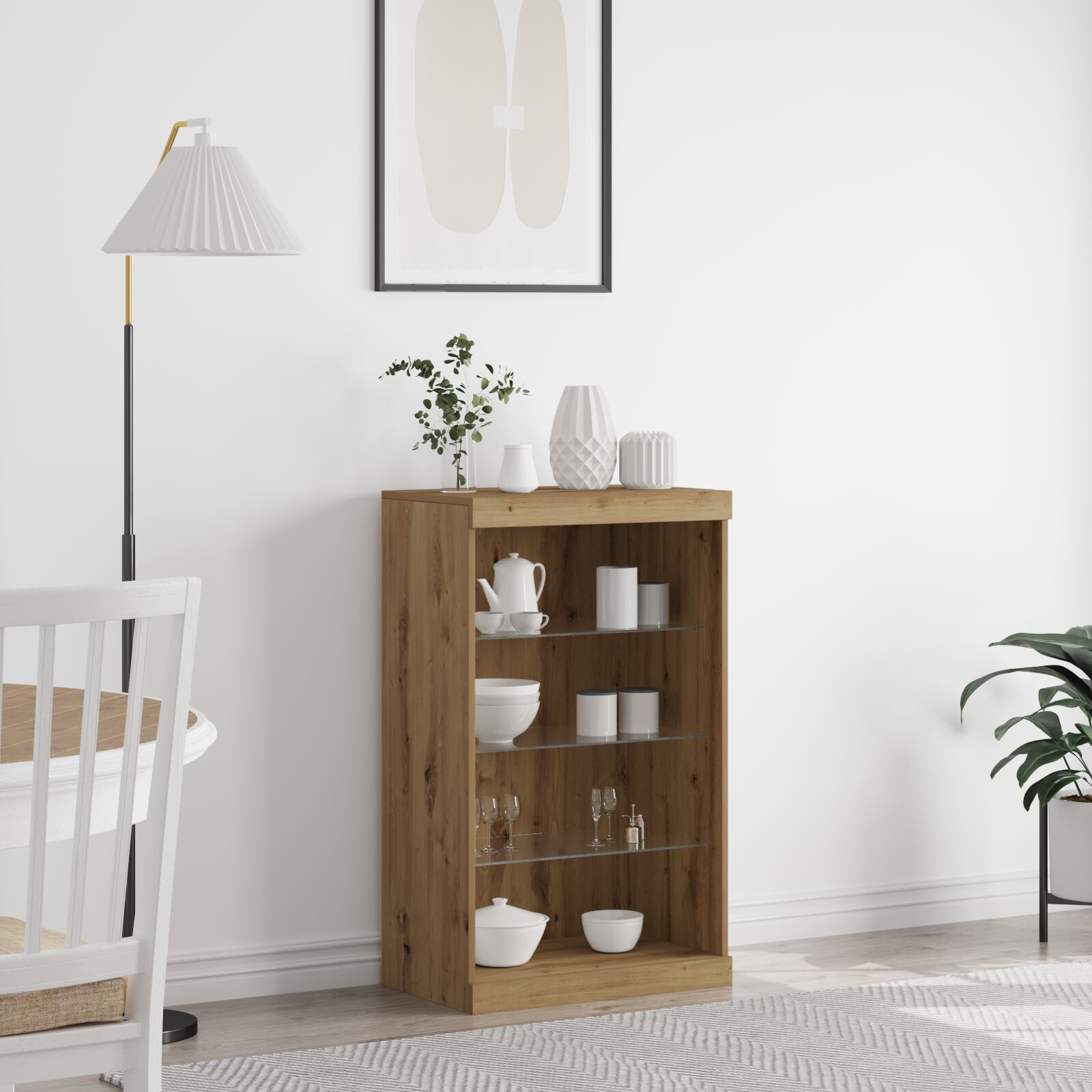 Der moderne Massivholz-Eichenschrank ist ideal fr dein Esszimmer oder Wohnzimmer. Sein schner Eichen-Finish und die glatte Oberflche verleihen ihm eine elegante Ausstrahlung und passen perfekt in moderne Huser. Er eignet sich hervorragend, um deine Lieblingsstcke zu prsentieren oder deinen Raum ordentlich zu halten. Mit drei Glasregalen ist er perfekt fr deine persnlichen Schtze oder ntzliche Alltagsgegenstnde. Die robuste Konstruktion aus massiver Eiche sorgt dafr, dass er lange hlt - eine tolle Wahl fr ein ordentliches und stilvolles Zuhause.