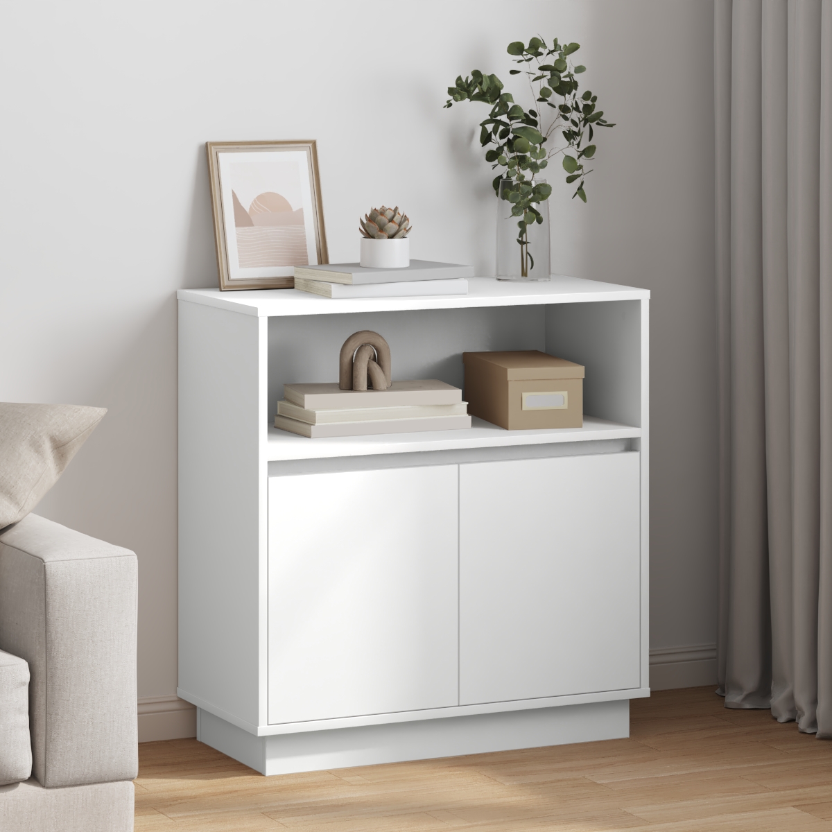 Dieses moderne weiße Buffet vereint Funktion und Stil und ist perfekt für jeden Ess- oder Wohnbereich. Die klaren Linien und die glatte matte Oberfläche sorgen für eine ruhige und elegante Ausstrahlung und passen gut zu verschiedenen Einrichtungsstilen. Viel Stauraum: Dieses Buffet hat zwei Türen, die sich zu geräumigen Fächern öffnen und perfekt sind, um Essutensilien, Geschirr und Servierplatten ordentlich unterzubringen. Genug Platz, damit alles griffbereit ist, wenn du Gäste hast. Das clevere Design vereint Praktikabilität und schönes Aussehen für jeden Haushaltsbesitzer. Integrierte Beleuchtung: Die eingebauten LEDs stellen nicht nur deine Lieblingsdeko zur Schau, sondern schaffen auch eine gemütliche, einladende Atmosphäre in deinem Essbereich. Die Akzentbeleuchtung kann an deine Stimmung angepasst werden, sodass jede Zusammenkunft, von entspannten Mahlzeiten bis zu festlichen Anlässen, besonders wirkt. Dieses Feature macht es zu einem Highlight in deinem Zimmer und nicht nur zu Stauraum. Verstellbare Regale: Mit verstellbaren Regalen kannst du den Innenraum leicht an verschiedene Größen anpassen. Diese Flexibilität ist super, um alles von großen Serviertellern bis hin zu feinem Geschirr zu verstauen und macht es dir einfach, deine Dinge so anzuordnen, wie du es möchtest. So viel Flexibilität hilft dir, den Stauraum des Buffets optimal auszunutzen. Stylisches Design: Das moderne Design mit sauberer weißer Oberfläche und eleganten Akzenten verleiht jedem Wohnstil einen Hauch von Eleganz. Sein minimalistischer Look fügt sich perfekt in zeitgenössische Themen ein und schafft einen attraktiven Blickfang in deinem Ess- oder Wohnzimmer, ohne mit vorhandenen Einrichtungen zu konkurrieren. Dieses Buffet erfüllt nicht nur einen Zweck, sondern verbessert das Gesamtgefühl deines Zuhauses. Qualitätsverarbeitung: Hergestellt aus strapazierfähigem MDF mit glatter Oberfläche, soll dieses Buffet lange halten und gleichzeitig eine luftige Ausstrahlung bewahren. Die robuste Bauweise garantiert Haltbarkeit und macht es zu einer soliden Investition für dein Zuhause. Die stabilen Verarbeitungen ergänzen das tolle Design, sodass du es viele Jahre lang genießen kannst.