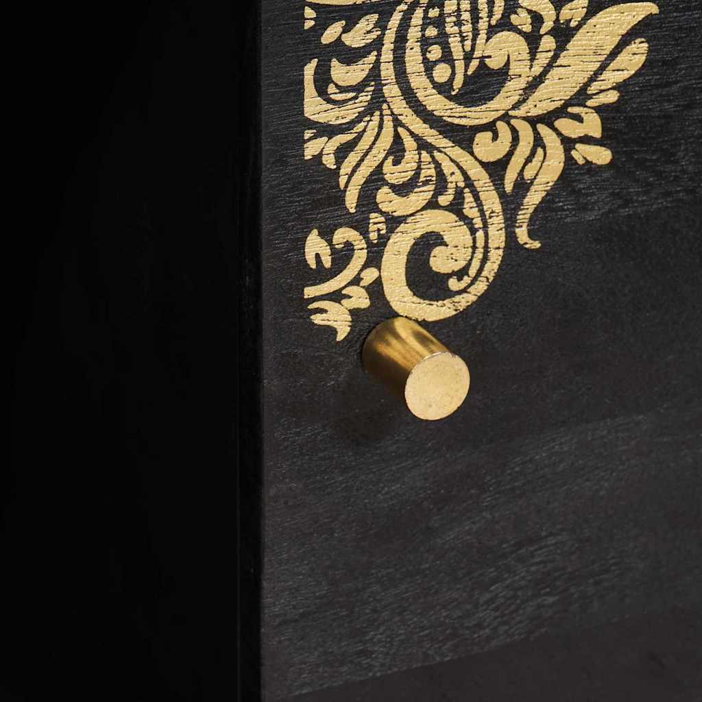 Dieses elegante Sideboard verbindet Stil und Funktionalität auf perfekte Weise und ist eine moderne Aufbewahrungslösung für jeden Raum. Mit seinem beeindruckenden rechteckigen Design aus massivem Mango-Holz fügt es sich perfekt in Esszimmer oder Wohnbereiche ein. Die auffälligen goldenen Details und Messingelemente verleihen einen Hauch von Luxus, der den zeitgenössischen Look perfekt ergänzt. Ob als Hingucker oder harmonisch in bestehende Einrichtungsstile, dieses Sideboard erfüllt die Erwartungen designaffiner Hausbesitzer. Materialien: Das Sideboard kombiniert massives Mango-Holz mit Holzwerkstoffen und bietet eine stabile und schicke Struktur. Die Materialwahl sorgt für Langlebigkeit, während die natürlichen Holzfarben warme Akzente setzen – ein Beispiel für Schönheit und praktische Haltbarkeit. Enthaltene Komponenten: Jeder Griff und jedes Bein aus Messing sorgt für einen luxuriösen Look, der sowohl Stil als auch Funktionalität erhöht. Das stabile Pfostenbeindesign macht das Sideboard zur tollen Ergänzung in jedem Zuhause und trägt problemlos schwere Deko oder Essutensilien. Eigenschaften / Funktion / Design: Geschmückt mit goldbedruckten Designs, ist das Sideboard sowohl dekorativ als auch funktional. Die Türen mit Scharnieren und Messingknöpfen öffnen sich und bieten viel Stauraum für Gegenstände aller Formen und Größen in seinen variablen Fächern. Raumdekor-Kompatibilität: Perfekt für Wohnzimmer, passt dieses Aufbewahrungselement sich verschiedenen Stilrichtungen an – von minimalistisch bis eklektisch – und bietet platzsparende Lösungen, ohne den Style zu verlieren. Pflege & Wartung: Die Oberfläche des Sideboards ist super pflegeleicht – einfach mit einem trockenen Tuch abwischen, um den glanzvollen Look zu erhalten. Diese einfache Pflege sorgt dafür, dass das Stück weiterhin als Blickfang im Raum strahlt, während es praktische Aufbewahrung bietet.