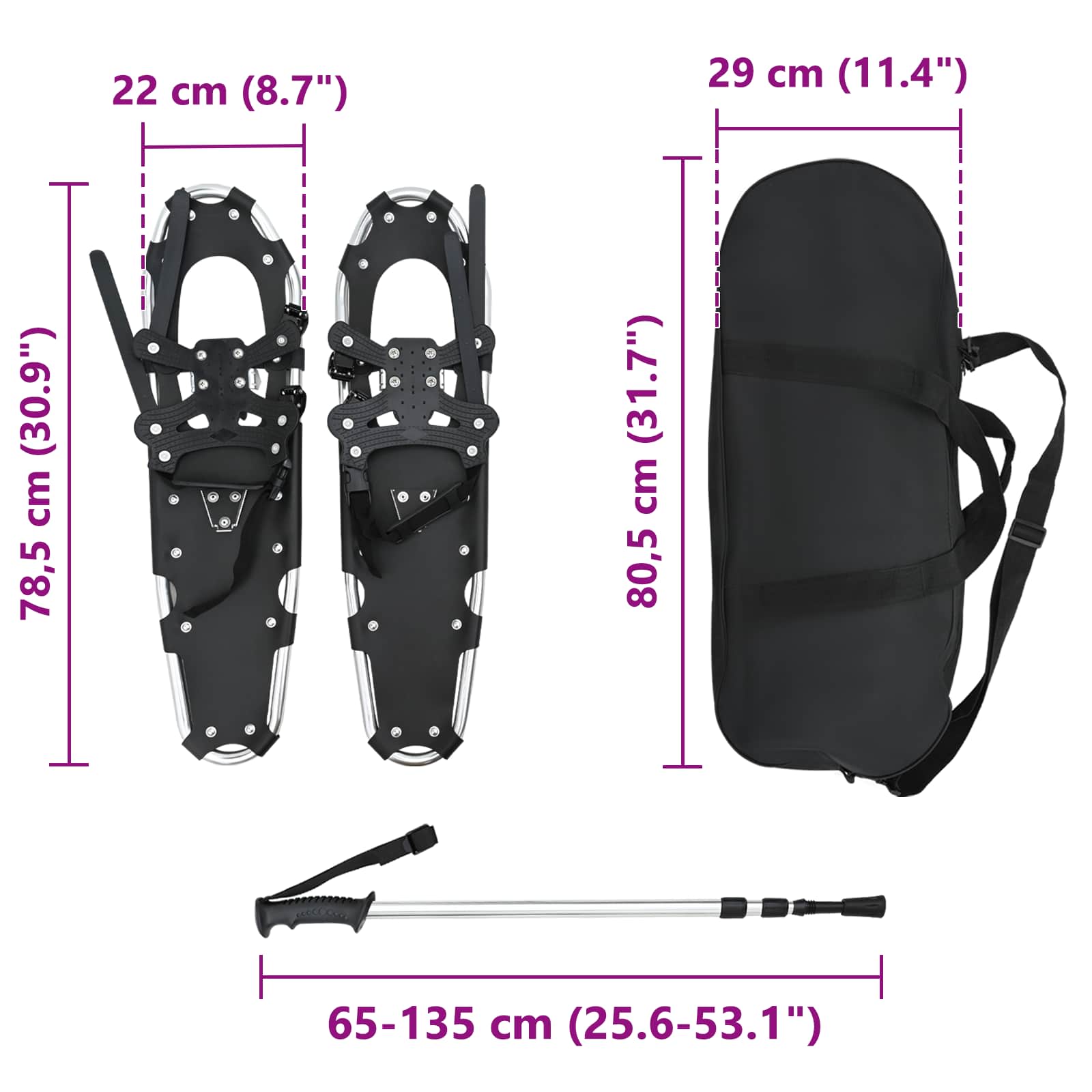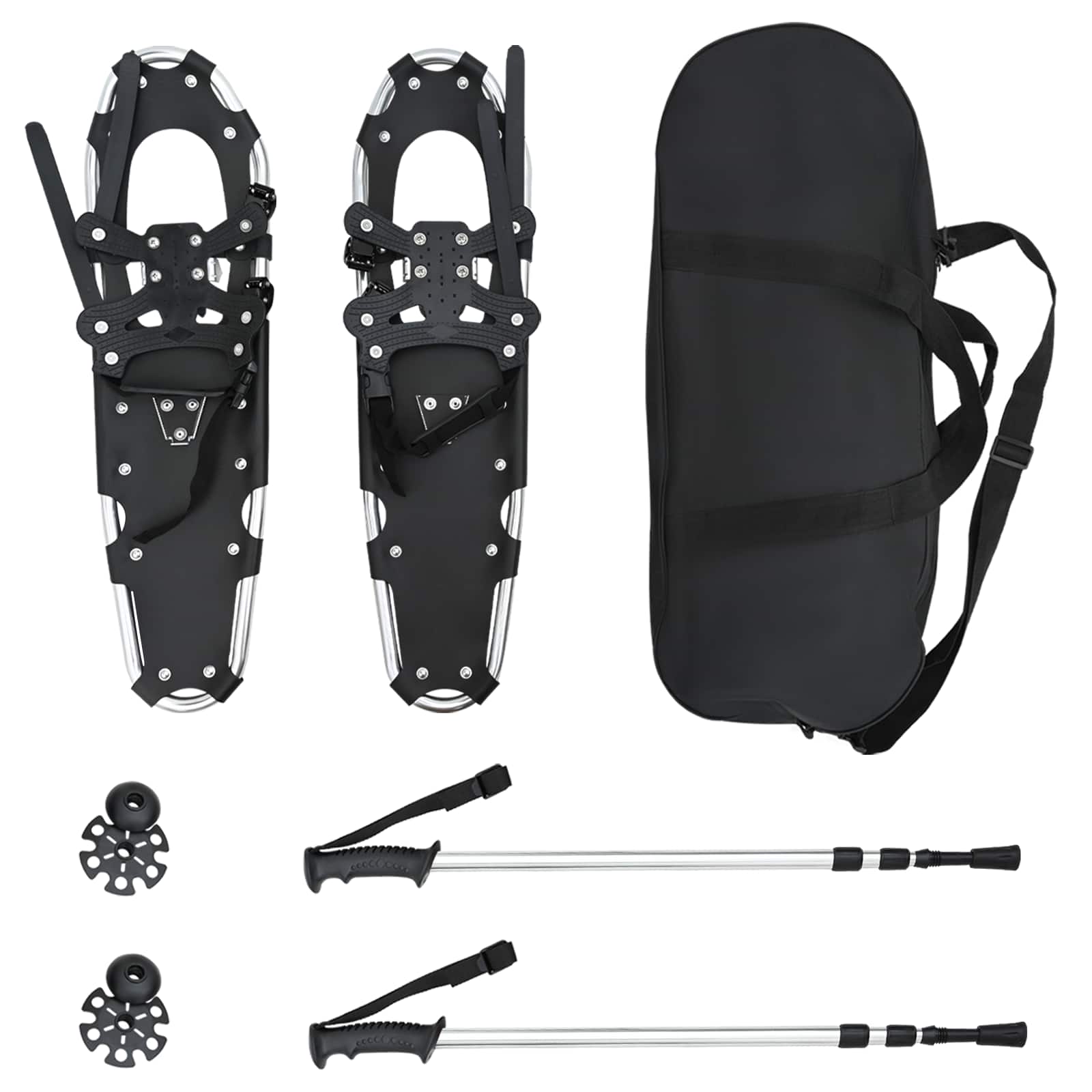 Dieses 3 IN 1 moderne Schneeschuhset mit Wanderstöcken ist perfekt für alle, die den Winter und Abenteuer im Schnee lieben. Es steht für einfache Handhabung und Funktionalität und verspricht ein leichtes Gleiten über schneebedeckte Wege, ideal für Outdoor-Fans. Durch sein modernes Design spricht es sowohl Anfänger als auch erfahrene Schneeschuhwanderer an, die nach Freiheit und Aufregung suchen. Aluminiumrahmen & Polyethylenboden: Robust und langlebig, hält der Aluminiumrahmen auch rauen Bedingungen stand. Die Kältebeständigkeit sorgt dafür, dass du sicher durch den Schnee kommst. Komplettset: Enthält ein Paar Schneeschuhe, zwei verstellbare Wanderstöcke und eine Tragetasche. Ideal für jeden, der alles für sein Schneewander-Abenteuer in einem Paket sucht. Alles ist leicht zu transportieren und zu lagern, damit du immer für Abenteuer gewappnet bist. Kältebeständige Eigenschaften: Der HDPE-Boden ist perfekt für kalte Umgebungen, und der verstellbare Fersenriemen sorgt dafür, dass deine Füße gut sitzen. So bleibst du auf jedem Terrain sicher und kontrolliert. Vielseitige Nutzung: Ob beim Wandern auf den Bergen oder in versteckten Wäldern, die Schneeschuhe passen von Größe 38 bis 48 und das Ratschen-System bietet eine flexible Anpassung für verschiedene Nutzer. Einfache Pflege: Bewahre die Ausrüstung an einem kühlen, trockenen Ort auf und wische sie mit einem trockenen Tuch ab, um sie in Top-Zustand zu halten. Vermeide den Gebrauch auf Asphalt, um den Boden zu schonen, und überprüfe sie vor jeder Wintersaison.