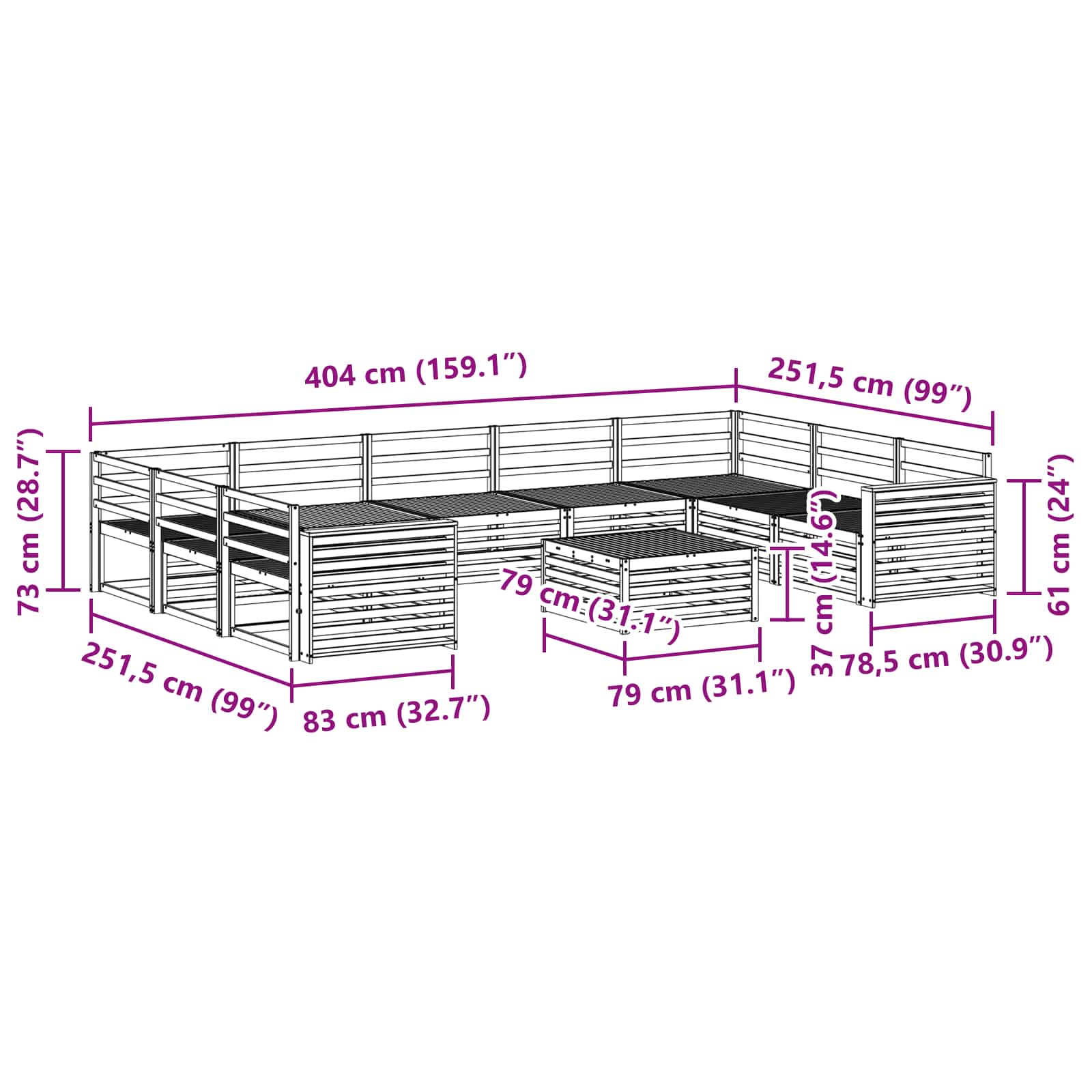 - Gesamtabmessungen: 404 x 251,5 x 73 cm (L x B x H)