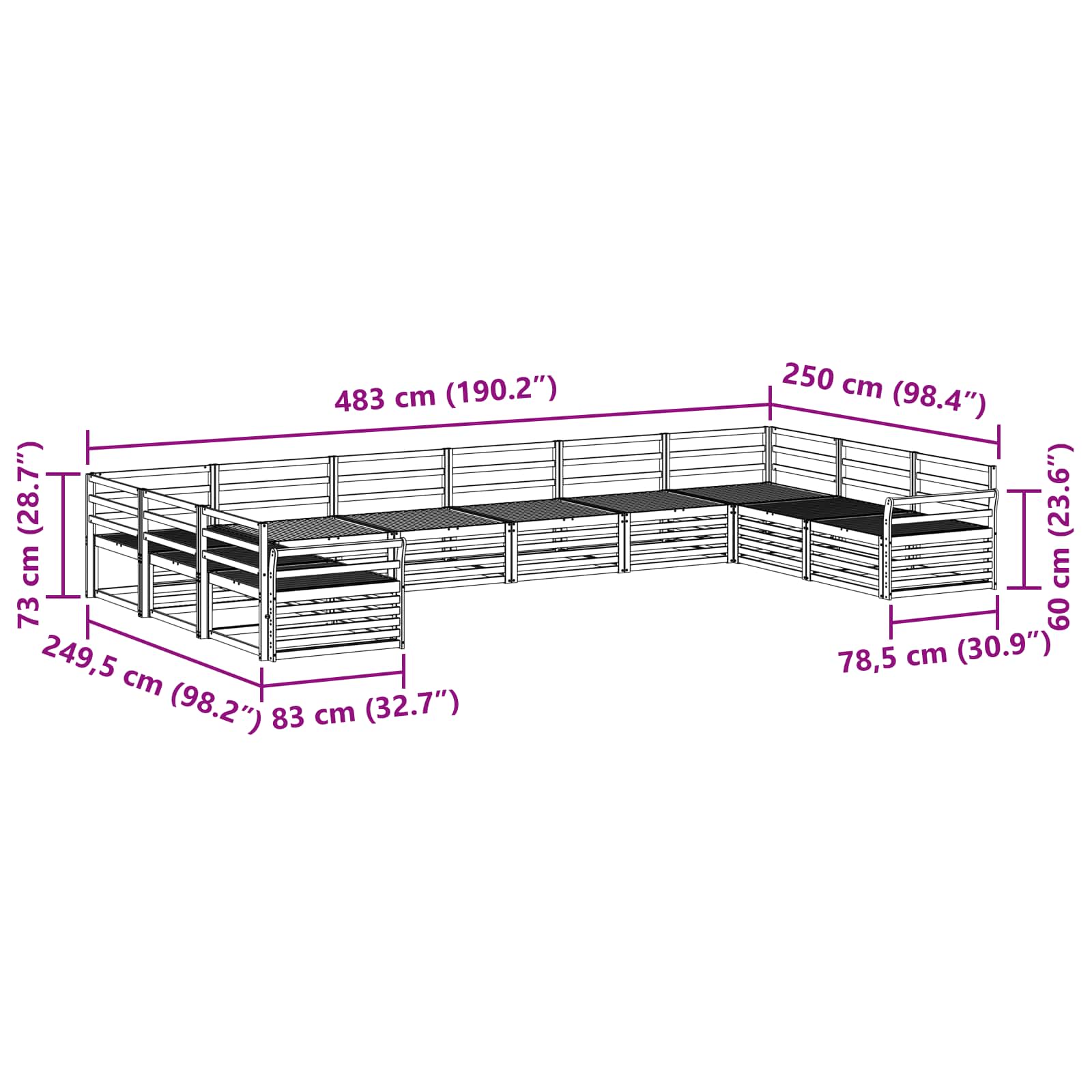 - Gesamtabmessungen: 483 x 250 x 73 cm (L x B x H)