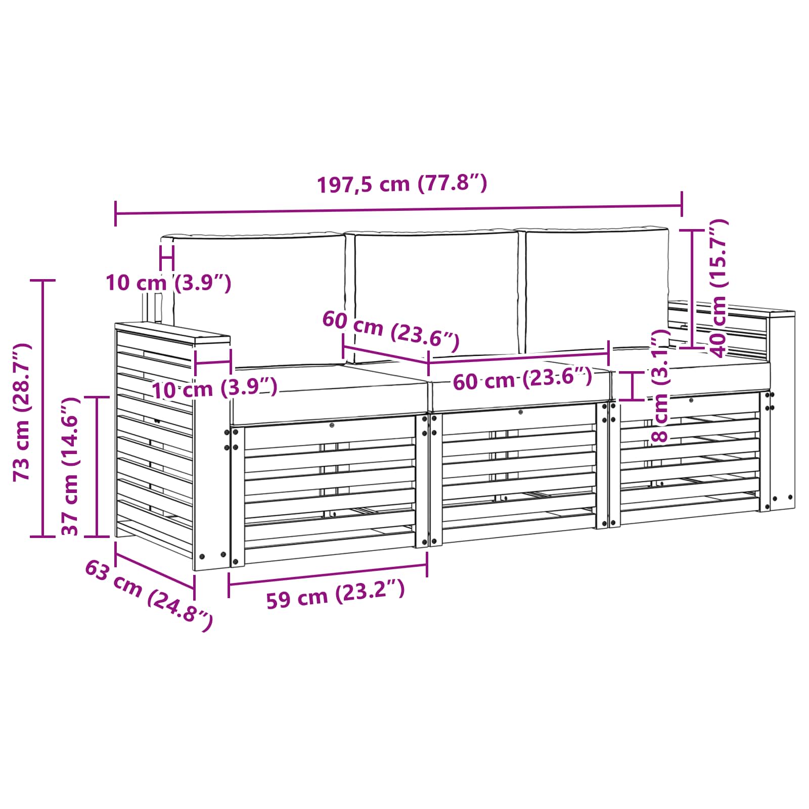- Gesamtabmessungen: 197,5 x 63 x 73 cm (L x B x H)
