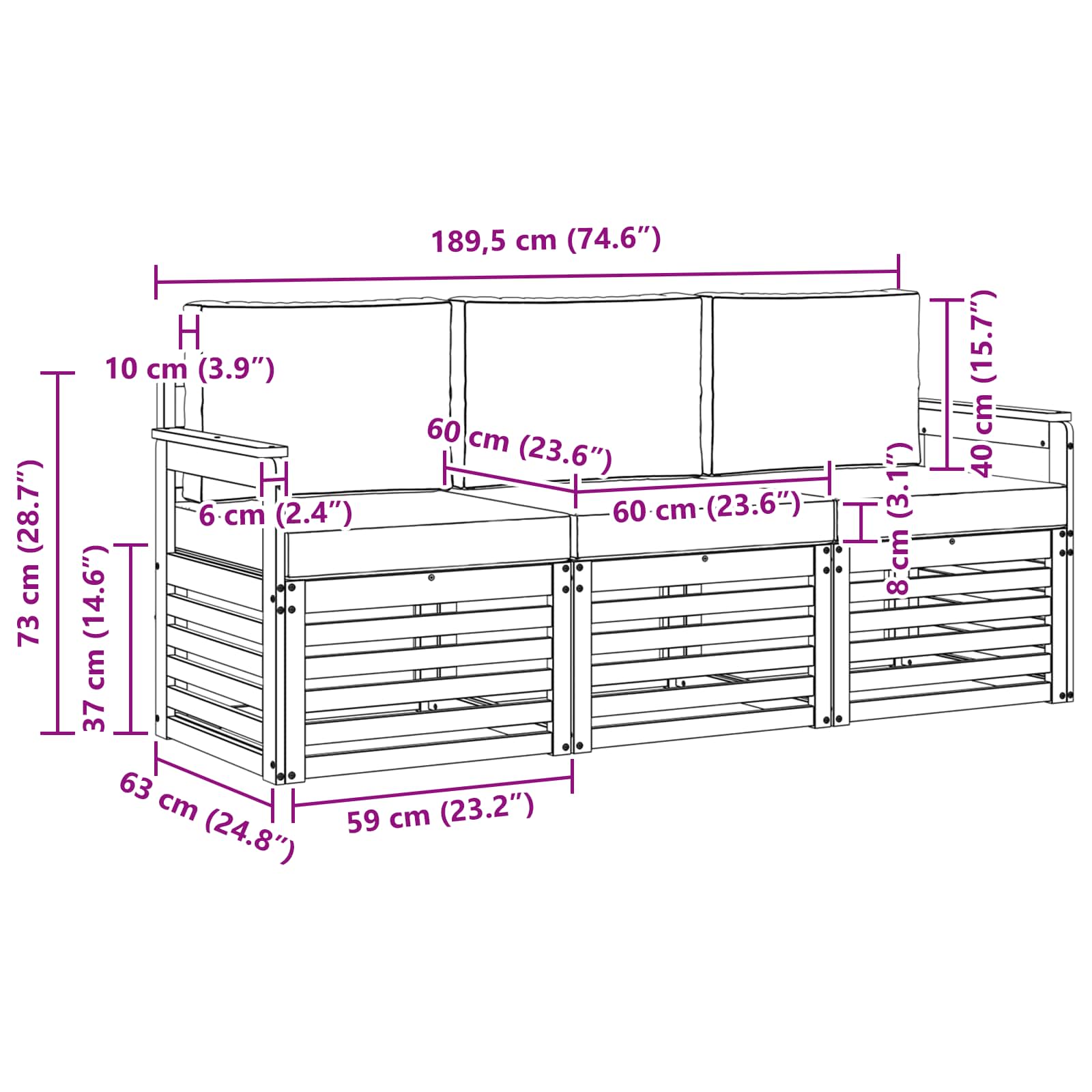 - Gesamtabmessungen: 189,5 x 63 x 73 cm (L x B x H)