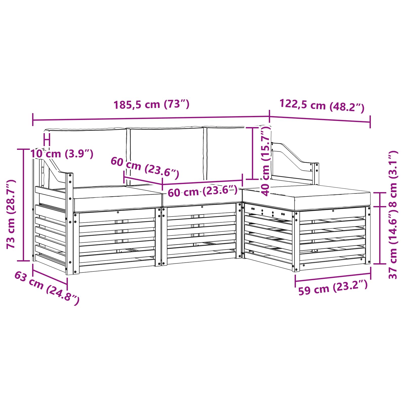 - Gesamtabmessungen: 185,5 x 122,5 x 73 cm (L x B x H)