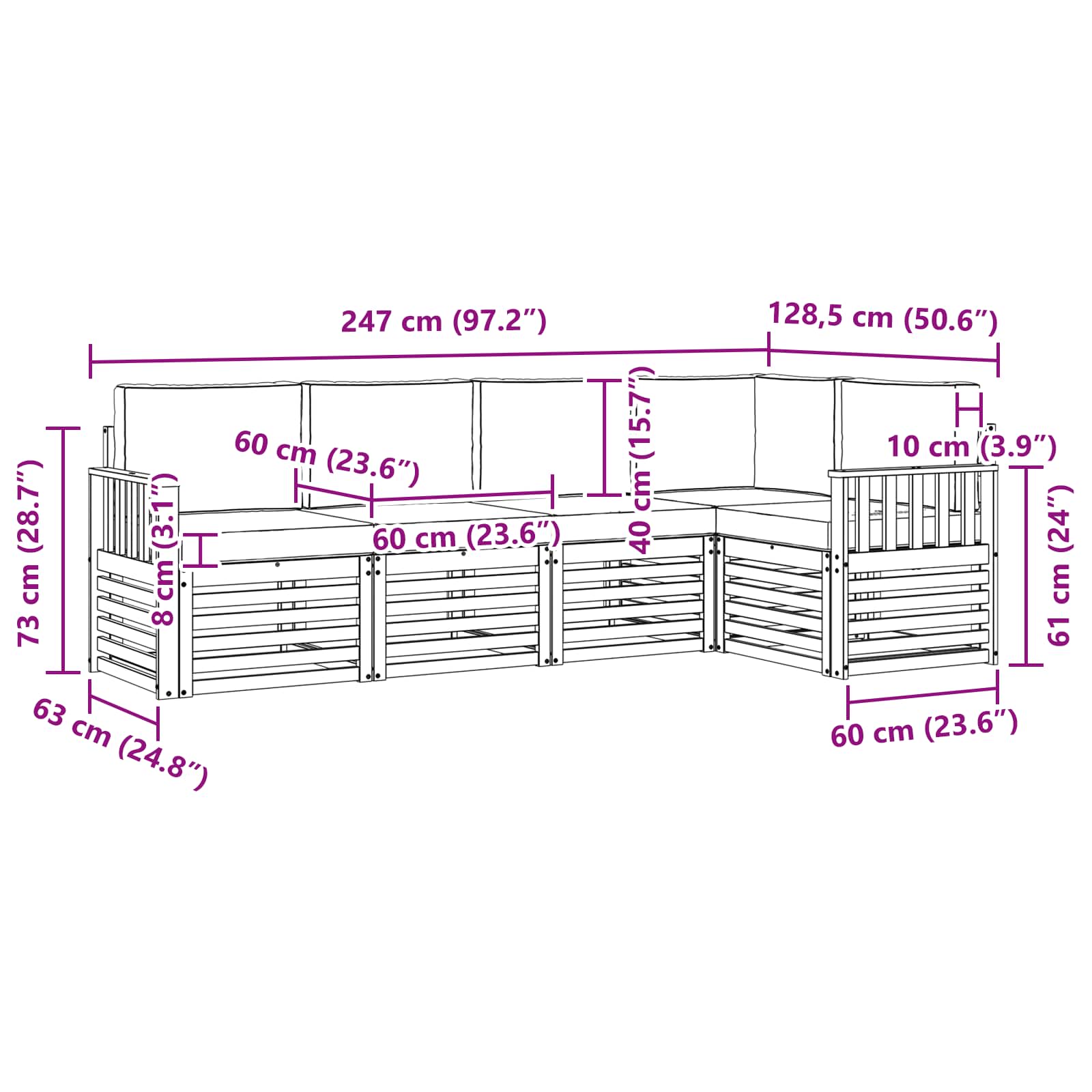 - 5 x Sitzkissen: 60 x 60 x 8 cm (LxBxH)