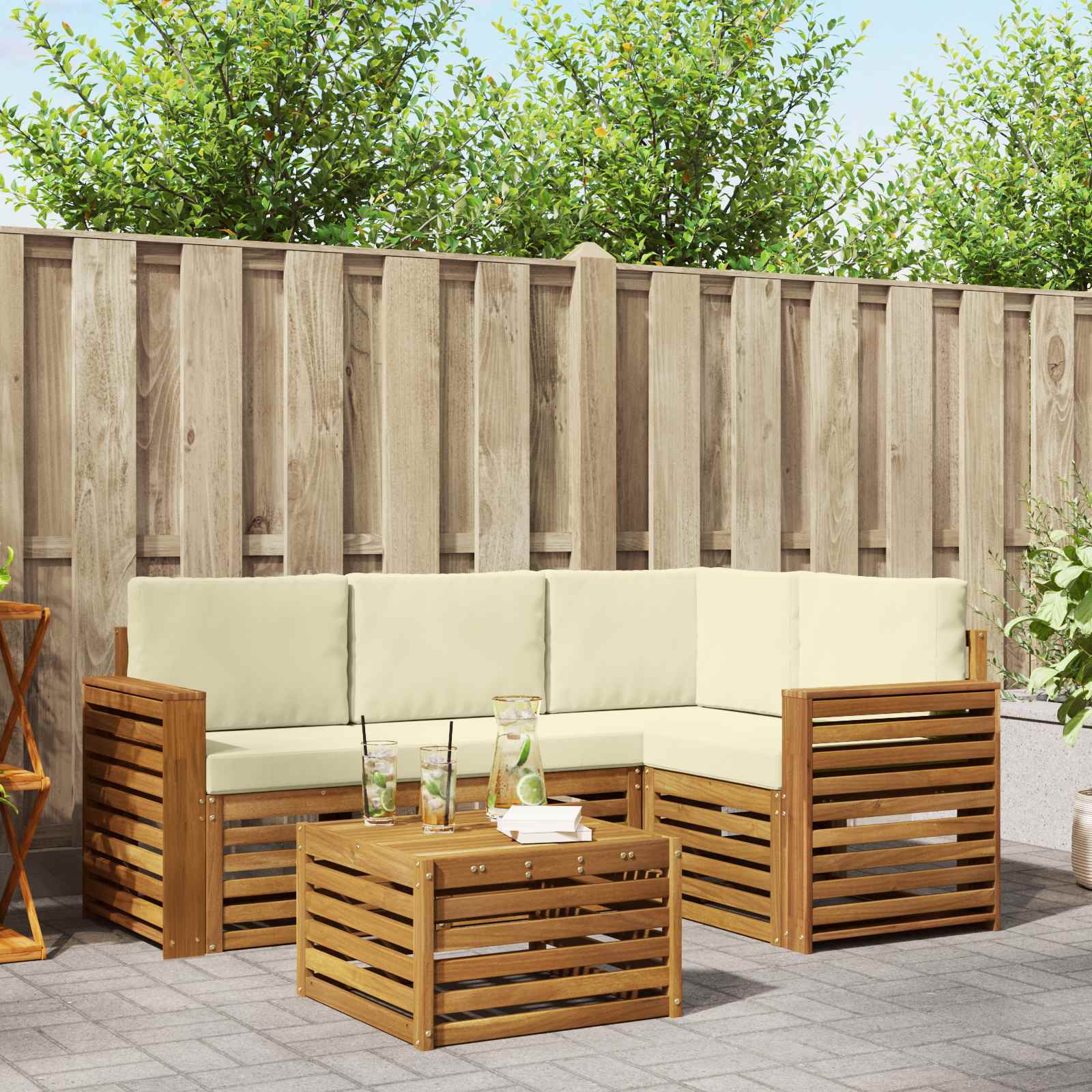 Dieses Outdoor-Sofa-Set vereint stylisches Design und praktische Funktionen und macht jeden Garten, jede Terrasse, jeden Poolbereich oder Hinterhof zum Schauplatz. Hergestellt aus massivem Akazienholz in einem warmen Braunton, strahlt es pure Gemütlichkeit aus. Das modulare Design fördert Kreativität und ermöglicht dir, die Sitzanordnungen easy für verschiedene Events umzugestalten – von gemütlichen Treffen bis hin zu großen Feiern. Material: Das massives Akazienholz sorgt für eine starke und langlebige Sitzlösung für Gartenpartys, Pool-Lounges oder Grillabende im Hinterhof. bekannt für seine tolle Textur und Widerstandsfähigkeit verbindet Akazienholz stylisches Design mit Langlebigkeit und ist perfekt für den Außenbereich. Modulare Konfiguration: Dieses Sofa lässt sich mit verschiedenen Modulen anpassen, um deinem Raum und deinen Vorlieben gerecht zu werden. Egal, ob du die Sofas für lange Gespräche anordnest oder gemütliche Ecken schaffst, die flexible Anordnung steigert die Nutzbarkeit und fördert kreative Ideen. Stylische Armlehnen: Jedes Stück hat Armlehnen aus Akazienholz, die den modernen Look unterstützen und für bequemen Sitz bieten. Ob du ein Buch liest oder plauderst, diese Armlehnen bringen dich zur Entspannung. Designmerkmale: Die modernen, geschlitzten Oberflächen machen das Möbelset echt attraktiv. Das schlichte Design passt super zu bestehenden Außenmöbeln und sorgt für die notwendige Luftzirkulation, was besonders an warmen Tagen toll ist. Pflegehinweise: Halte den coolen Look, indem du das Set einfach mit einem feuchten Tuch abwischst. So bleibt es nicht nur stylisch, sondern auch eine leichte Ergänzung für deinen Außenbereich.