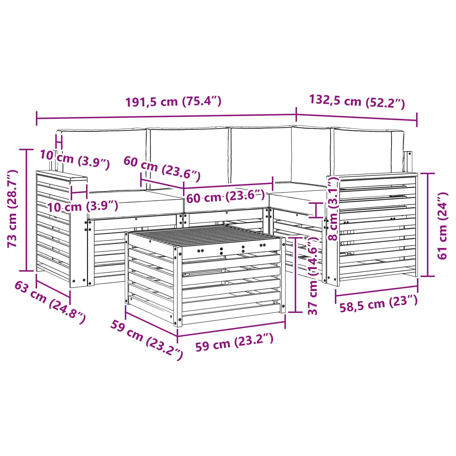 - 4 x Sitzkissen: 60 x 60 x 8 cm (LxBxH)
