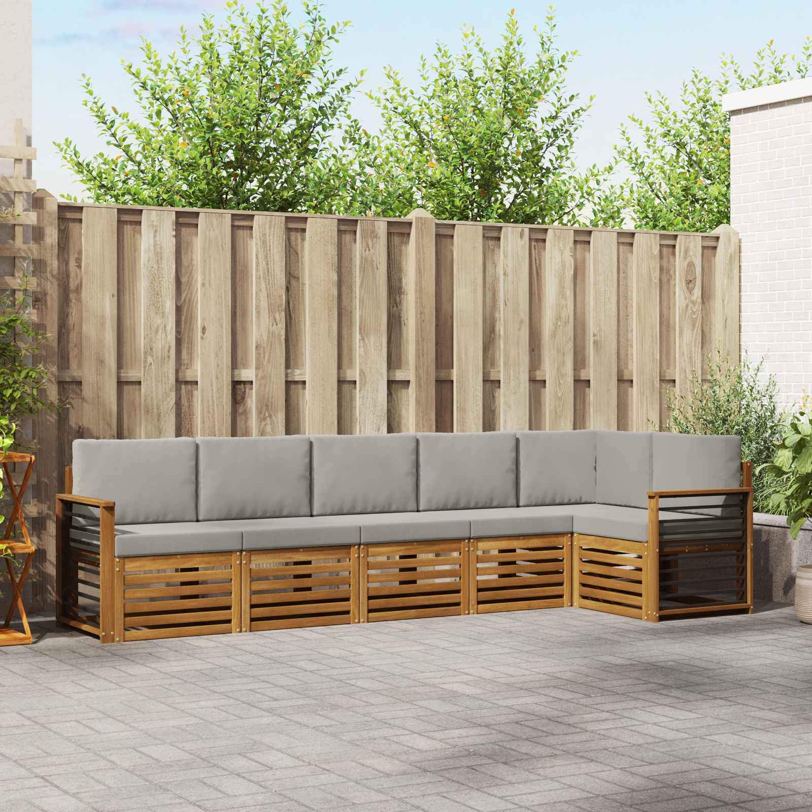 Dieses Möbelset für draußen kombiniert coolen Style mit praktischen Features und setzt ein stylisches Highlight in jedem Garten oder auf jeder Terrasse. Mit ihrem modernen Design, einfachen Linien und minimalen Details sorgt es für Eleganz und perfekte Voraussetzungen, um im Freien zu entspannen oder gesellige Runden zu genießen. Ganz aus massivem Akazienholz gefertigt, bietet das Set Langlebigkeit und sieht über die Zeit immer gut aus - die ideale Wahl für alle, die Design und Funktionalität schätzen. Langlebiges Massivholz Akazie: Das Außenmöbelset ist aus robustem Akazienholz gefertigt, das super haltbar ist und sich gut an die Wetterbedingungen anpasst. Die robuste Bauweise sorgt für Stabilität und Langlebigkeit, während die warme Farbe jede Garten- oder Terrassengestaltung aufpeppt. Wetterbeständiges Design: Die lackierte Oberfläche des Sets bietet zusätzlichen Schutz vor Sonne, leichtem Regen und anderen Witterungen. Die polierte Oberfläche hilft, die Optik und Funktionalität langfristig zu bewahren und sorgt dafür, dass die Möbel in deinem Garten, auf der Terrasse oder im Hinterhof immer gut aussehen. Komponenten und Design: Jedes Teil, von den Armlehnen bis zu den Rückenlehnen, wurde sowohl stilvoll als auch funktional gestaltet. Die unterstützenden Elemente tragen zusätzlich zum Komfort bei, während das einheitliche Design ein harmonisches Gesamtbild für verschiedene Outdoor-Anlässe schafft. Komfort und Vielseitigkeit: Das modulare Design ermöglicht flexible Anordnungen, die für verschiedene Räume und Bedürfnisse passen. Egal, ob du entspannst, Gäste einlädst oder ruhig lesen möchtest - dieses Set fügt sich mühelos in jede Außenumgebung ein und sorgt für maximalen Komfort und Nutzung. Einfache Pflege: So bleiben die Möbel schön: einfach mit einem feuchten Tuch abwischen und aggressive Reiniger vermeiden. Regelmäßige Pflege hält die Möbel top und verlängert ihre Lebensdauer.