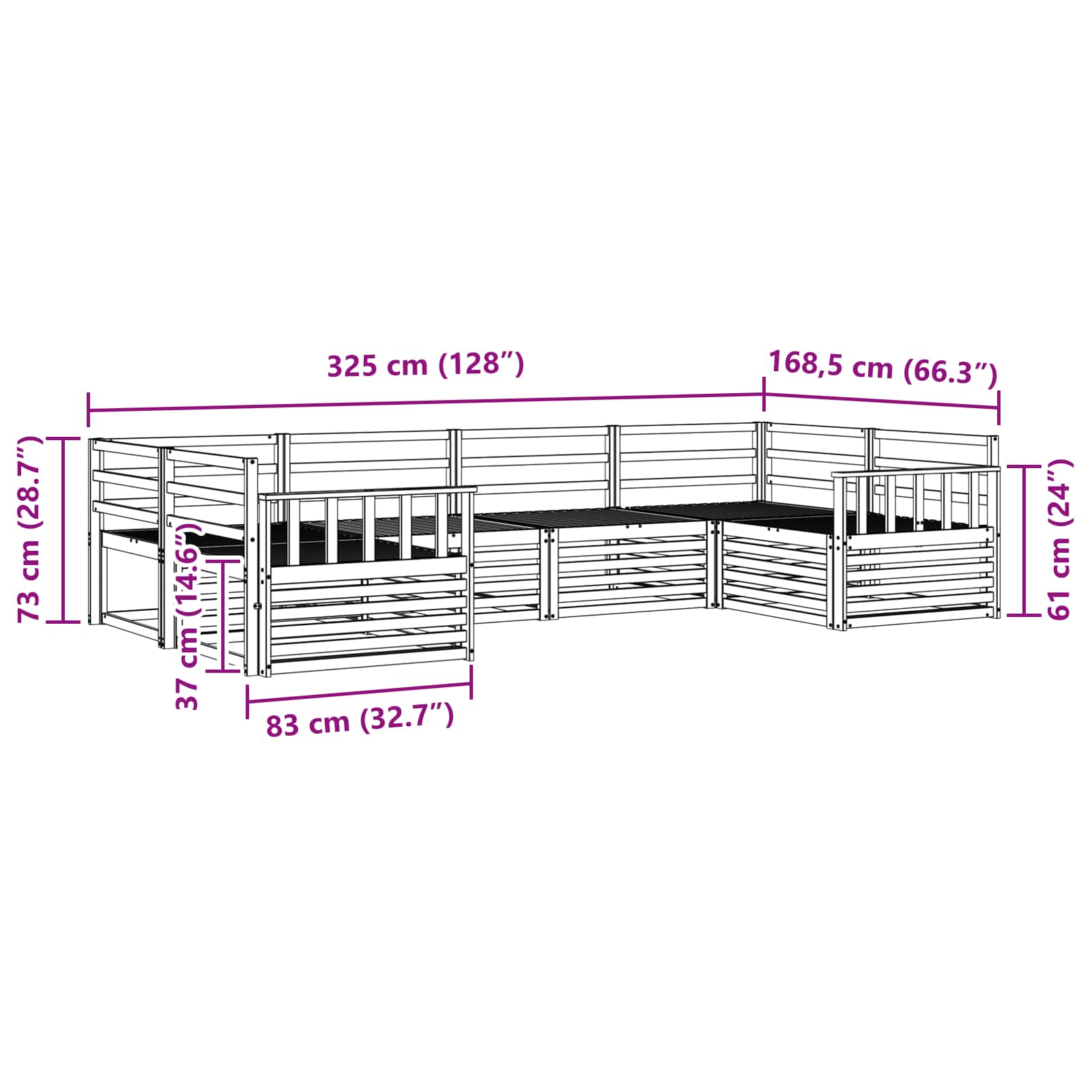 - Gesamtabmessungen: 325 x 168,5 x 73 cm (L x B x H)