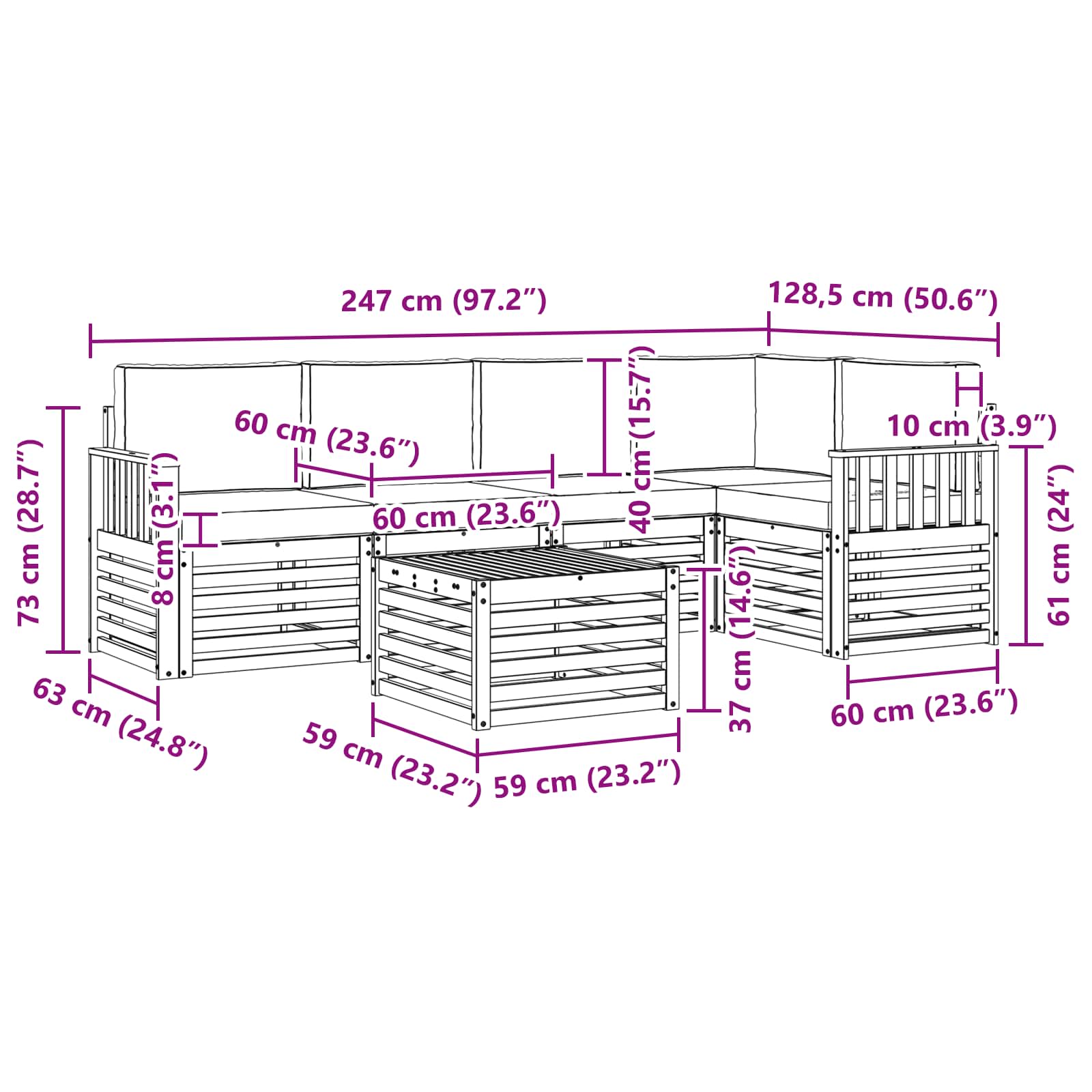 - 5 x Sitzkissen: 60 x 60 x 8 cm (LxBxH)
