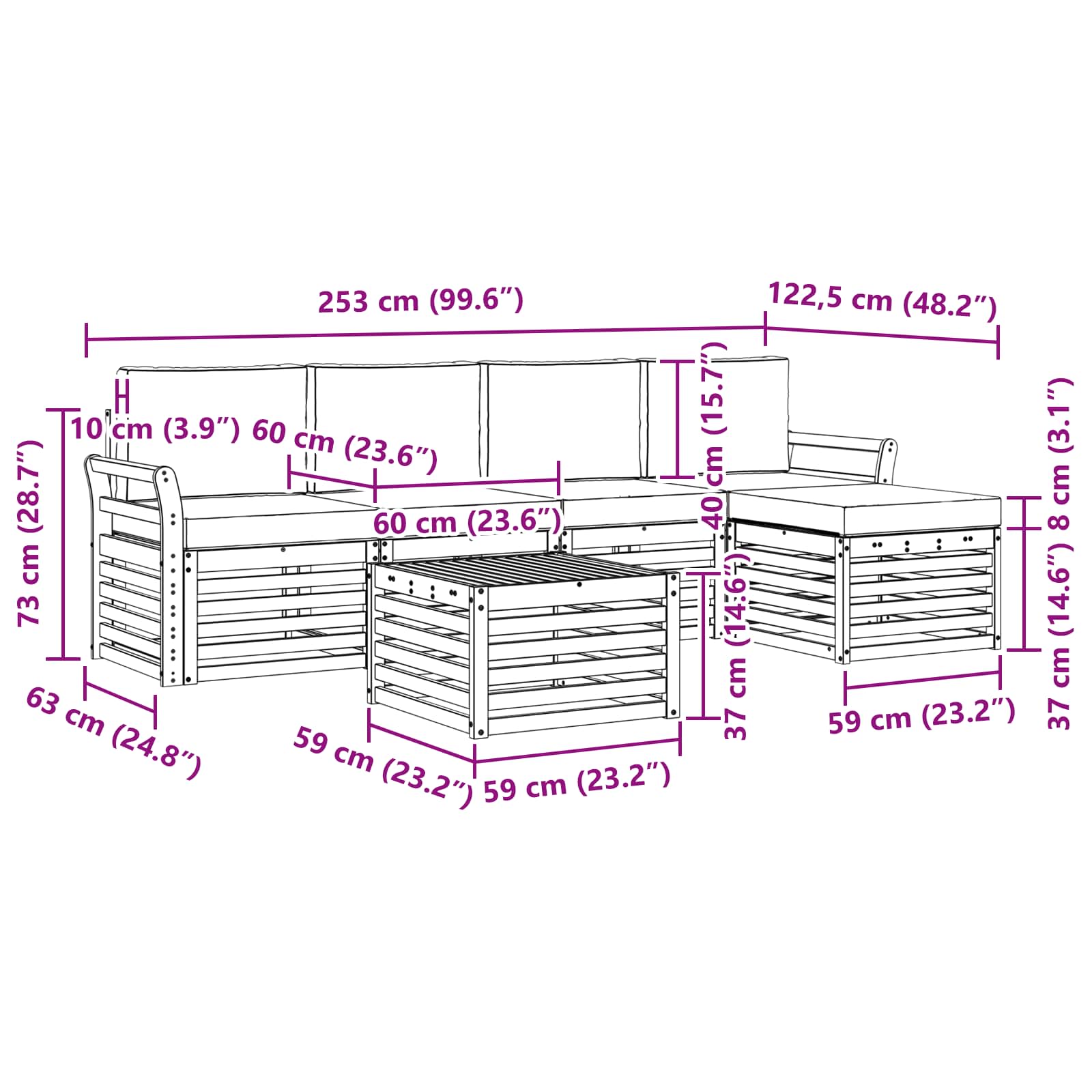 - 5 x Sitzkissen: 60 x 60 x 8 cm (LxBxH)