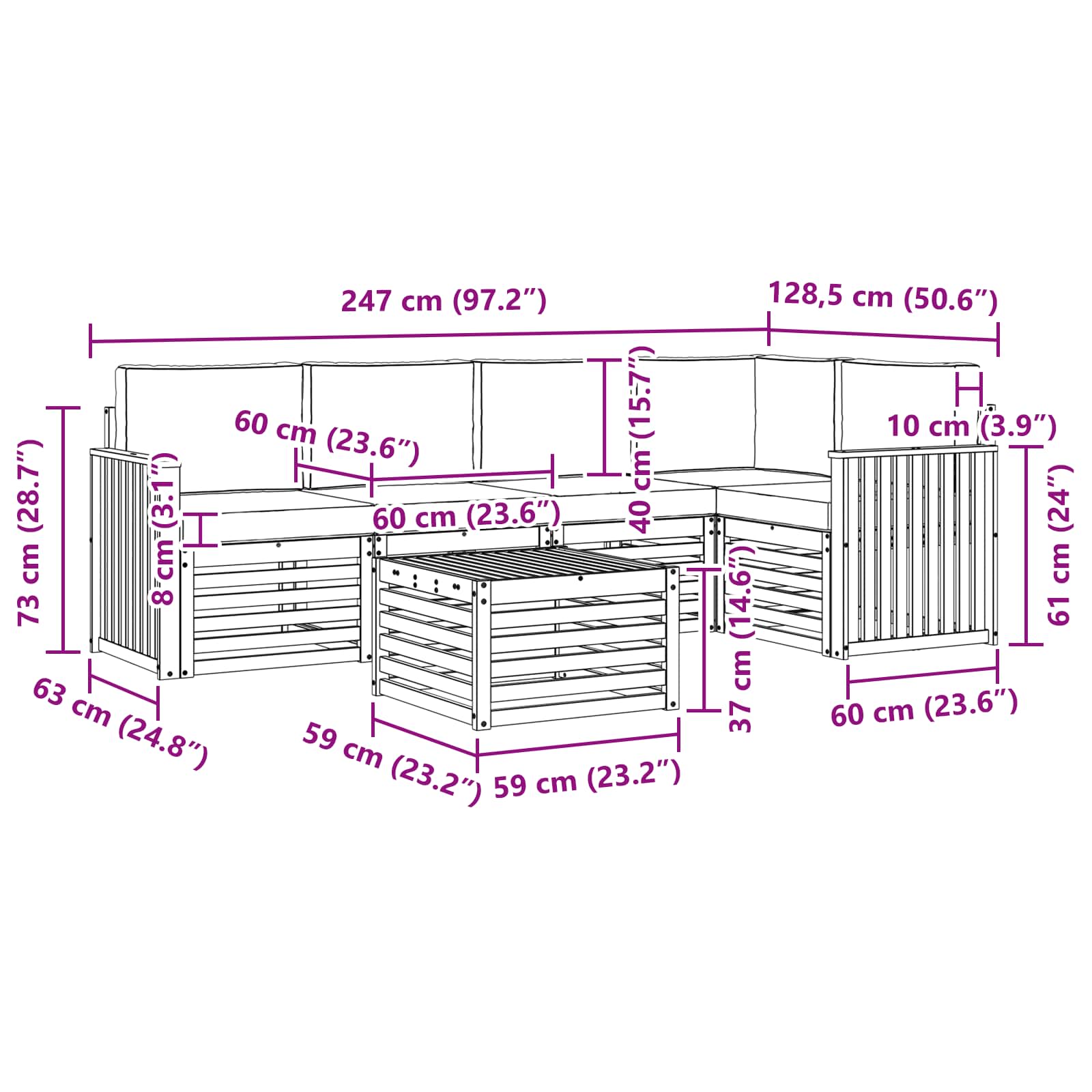 - 5 x Sitzkissen: 60 x 60 x 8 cm (LxBxH)