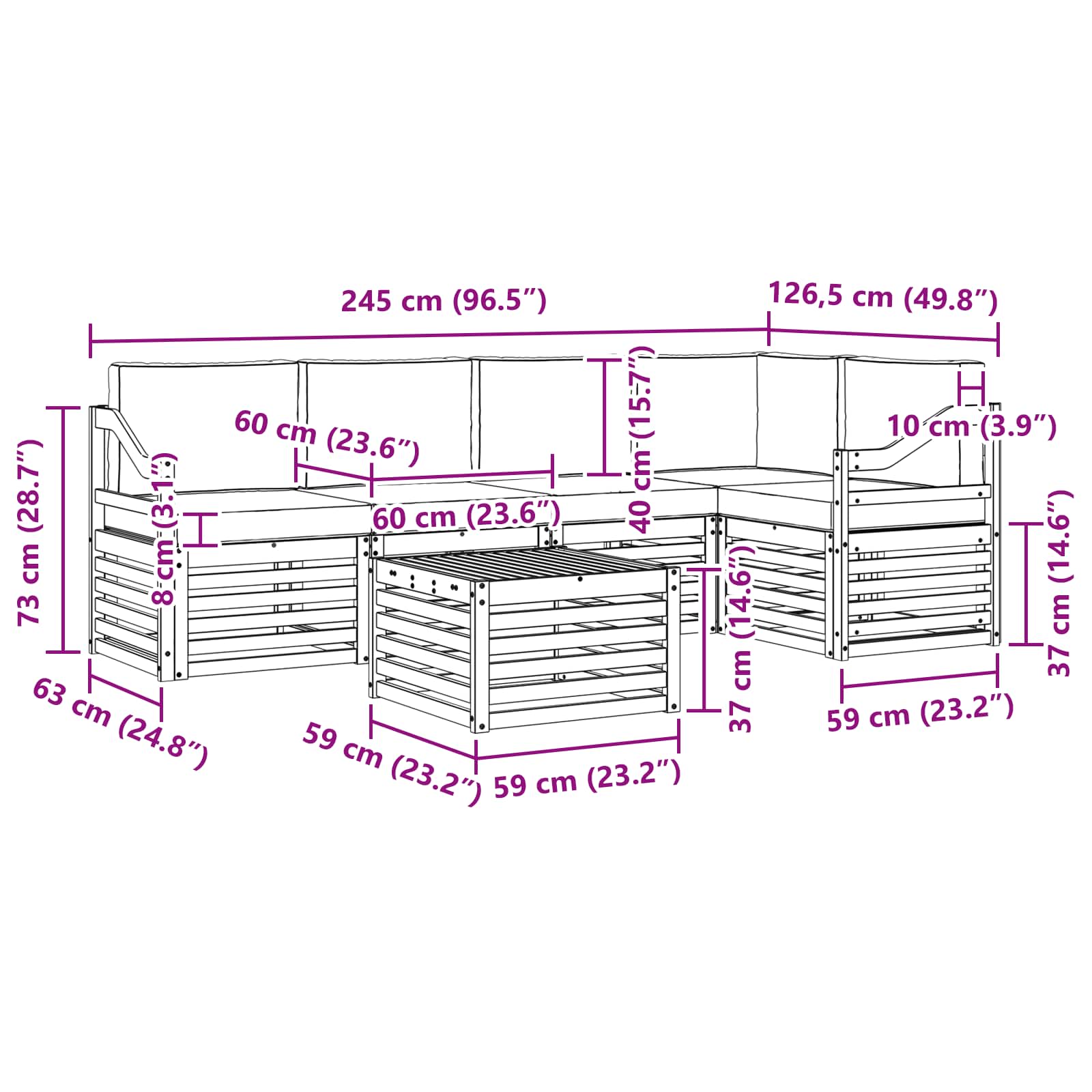 - 5 x Sitzkissen: 60 x 60 x 8 cm (LxBxH)
