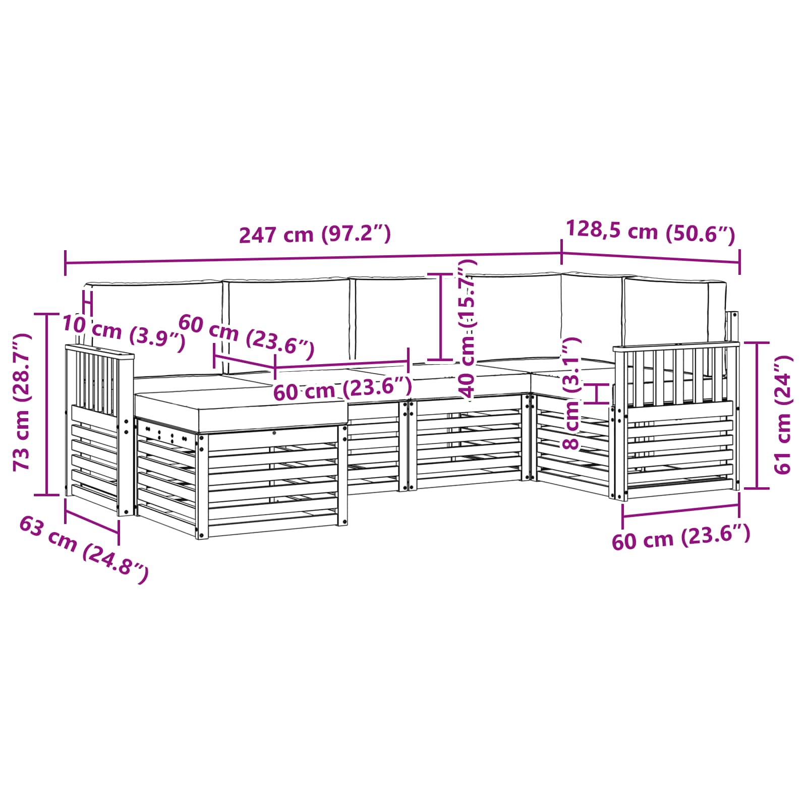 - 6 x Sitzkissen: 60 x 60 x 8 cm (LxBxH)