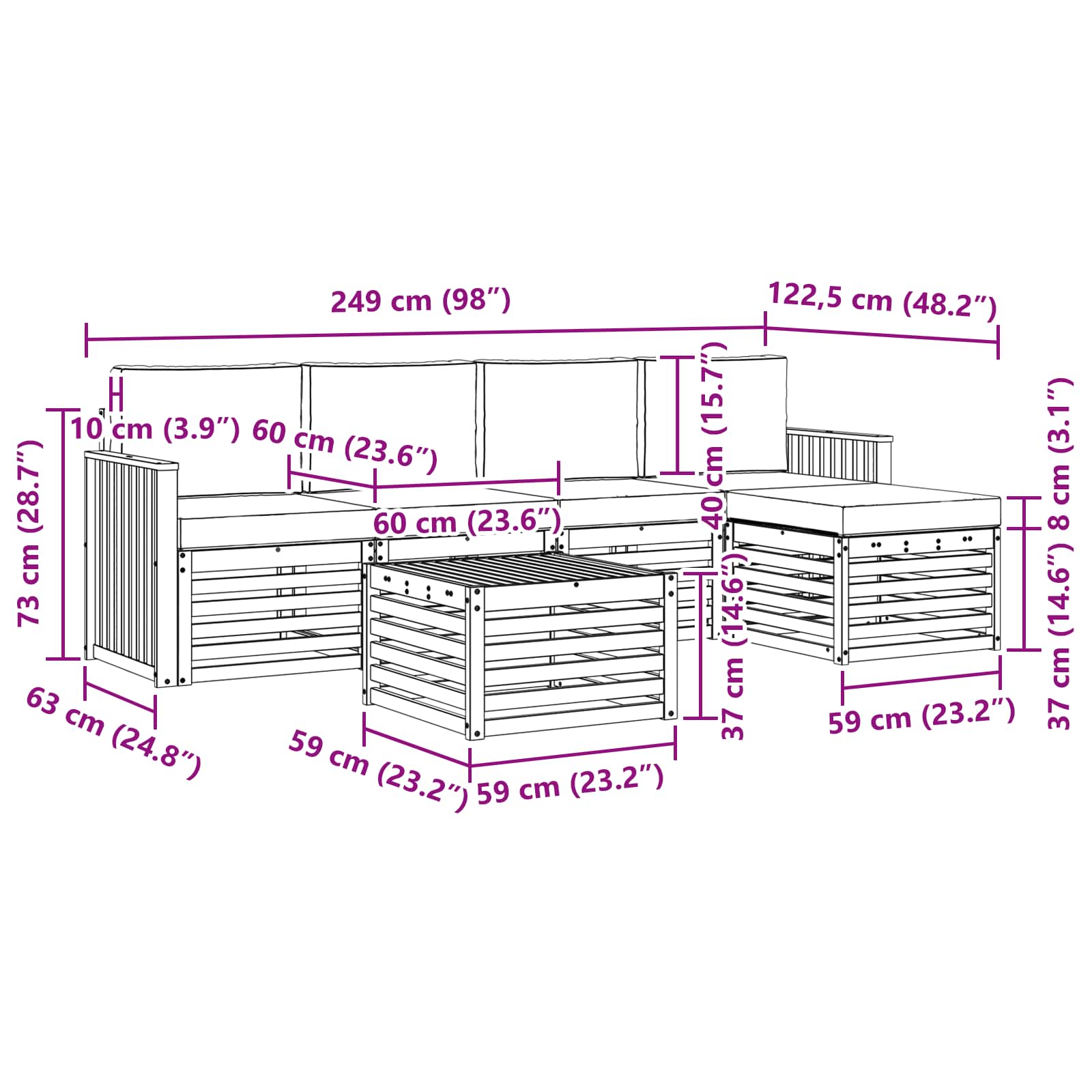 - 5 x Sitzkissen: 60 x 60 x 8 cm (LxBxH)
