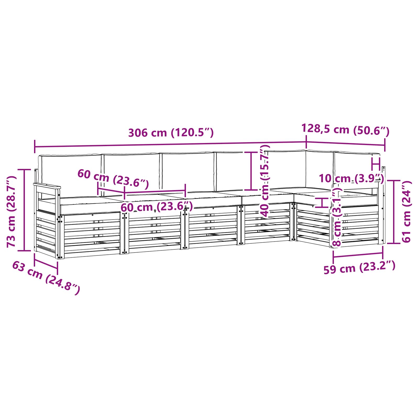 - Gesamtabmessungen: 306 x 128,5 x 73 cm (L x B x H)
