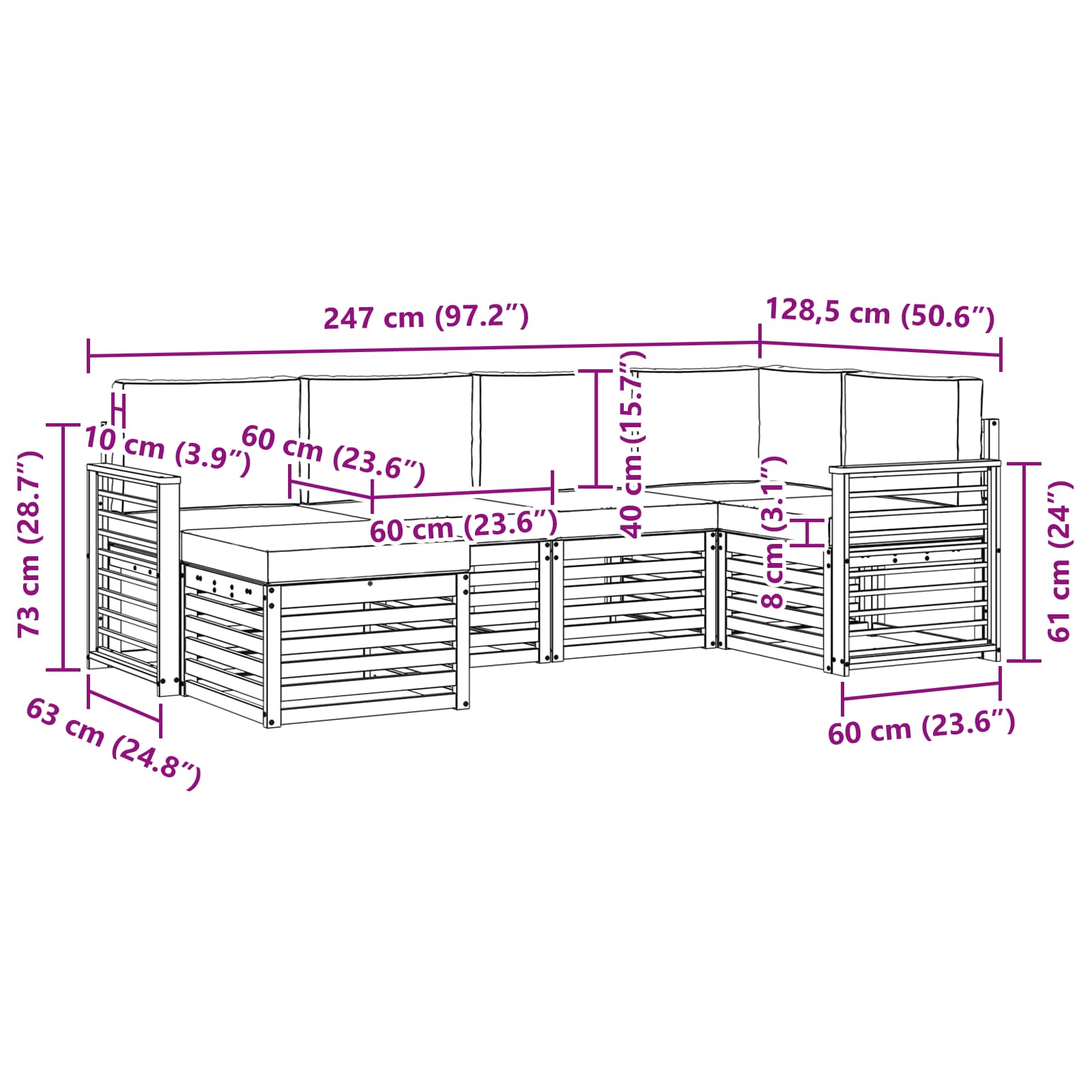 - 6 x Sitzkissen: 60 x 60 x 8 cm (LxBxH)