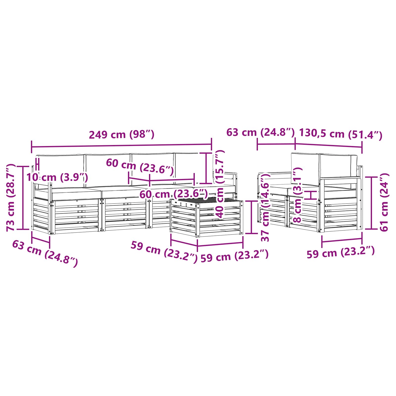 - 4 x Armlehnen: 59 x 6 x 61 cm (LxBxH)
