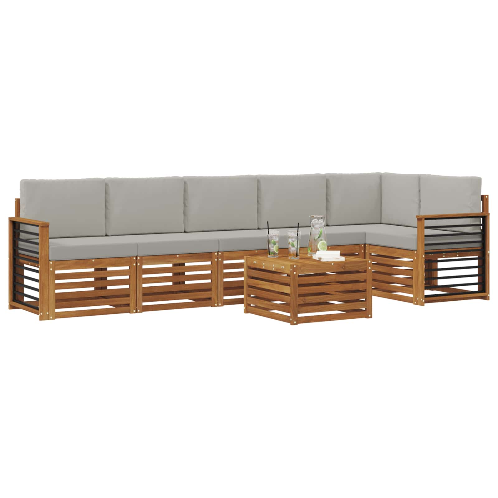 Dieses schicke Outdoor-Sofaset aus solidem Akazienholz ist der Inbegriff von Stil und Langlebigkeit. Es eignet sich klasse für Gärten, Terrassen und Poolbereiche. Mit seinem modernen, schlanken Design kannst du die Möbel ganz nach deinen Wünschen anordnen. Erschaffe eine entspannende und freundliche Atmosphäre mit den warmen Brauntönen, die sich super in die natürliche Umgebung einfügen – ideal für chillige Nachmittage oder gesellige Treffen. Materialien: Hergestellt aus solidem Akazienholz, zeigt dieses Set die natürliche Holzmaserung und hat eine tolle braune Oberflächenbehandlung. Akazienholz ist bekannt für seine Langlebigkeit und Wetterfestigkeit, damit es immer gut aussieht, egal bei welchem Wetter. Enthaltene Komponenten: Genieß den besonderen Komfort mit den massiven Akazienholz-Armliegen und -Sitzen, die nicht nur toll aussehen, sondern auch super bequem sind. Jedes Teil passt perfekt ins Gesamtbild und sorgt für ein entspanntes Sitzen. Eigenschaften / Funktion / Design: Mit einer lamellenförmigen Fläche für eine gute Luftzirkulation und um Wasseransammlungen zu vermeiden, bleibt dieses Set funktional und sieht dabei auch noch richtig gut aus. Der moderne Stil ist einfach und passt perfekt zu zeitgenössischen Außenbereichen und bietet sowohl Form als auch Funktion. Empfohlene Verwendungen: Perfekt für Garten-, Patio- oder Poolbereich, das Set deckt deine Unterhaltung und Entspannung bestens ab. Das flexible Design ermöglicht dir, die Möbel ganz nach Bedarf zu arrangieren – ideal für Treffen mit Freunden oder ruhige Rückzüge. Pflege & Wartung: Halte es in Top-Zustand mit einfacher Pflege – wisch einfach regelmäßig mit einem feuchten Tuch drüber, um Staub und Schmutz zu entfernen. So sorgt es immer für einladende und gemütliche Stimmung.