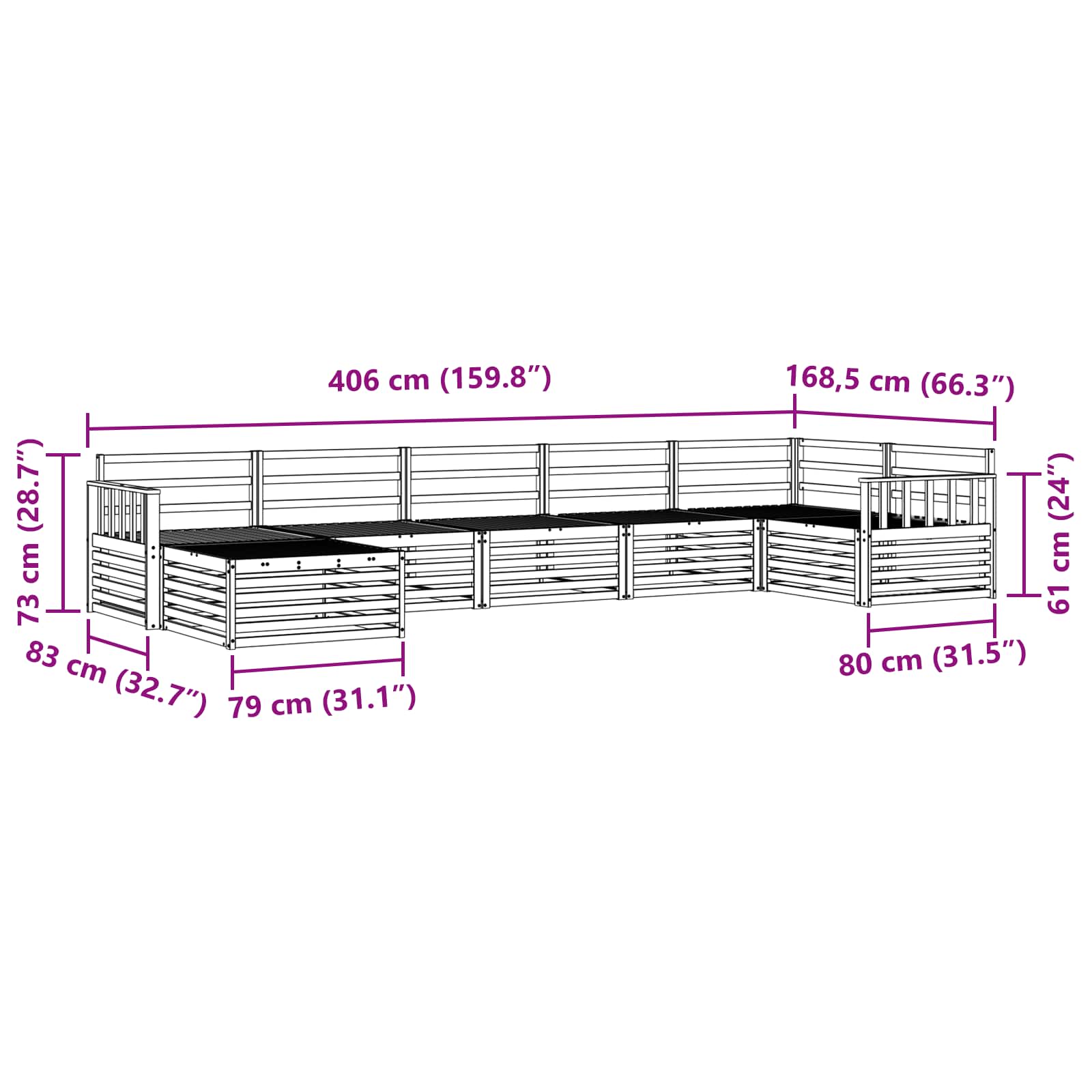 - Gesamtabmessungen: 406 x 168,5 x 73 cm (L x B x H)