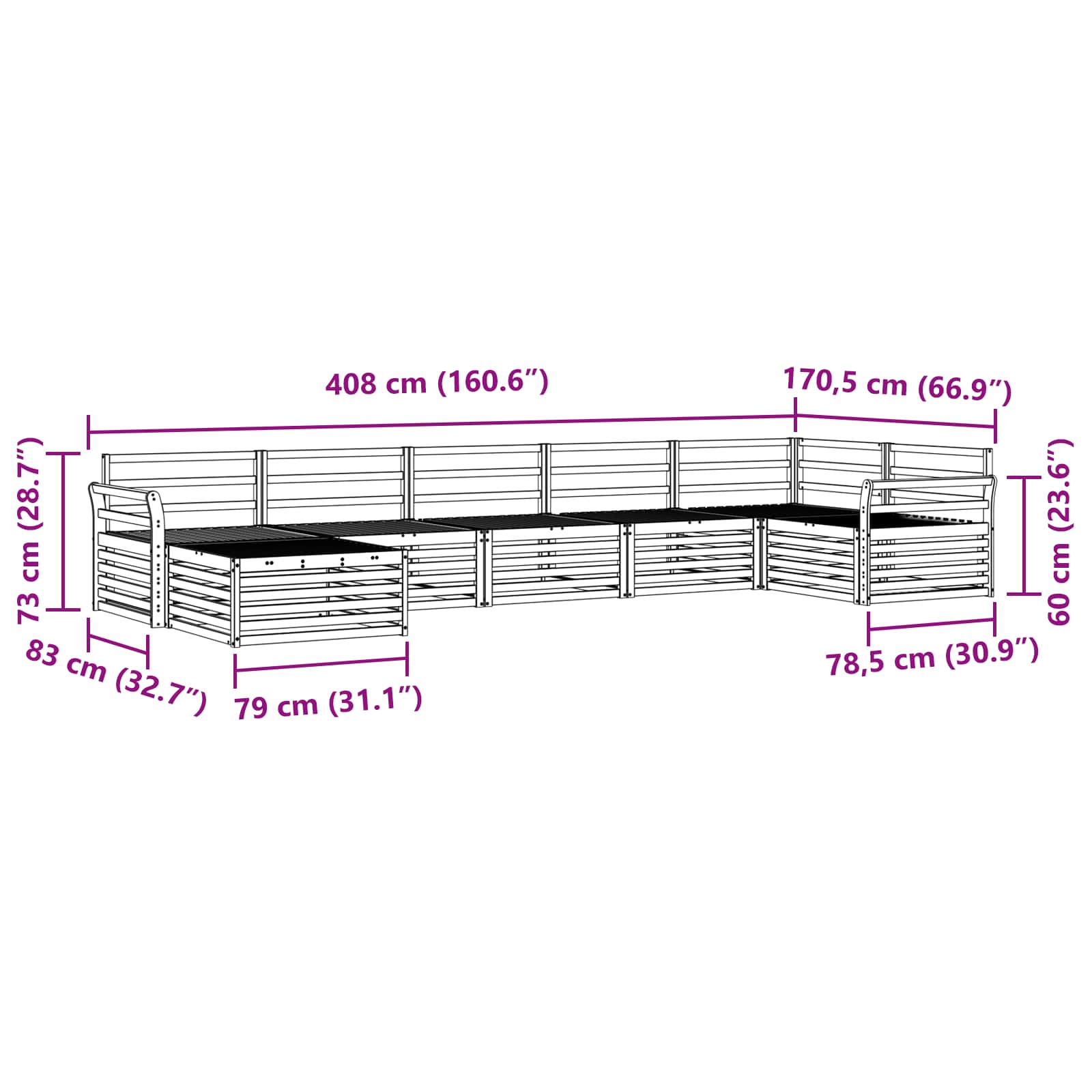 - Gesamtabmessungen: 408 x 170,5 x 73 cm (L x B x H)