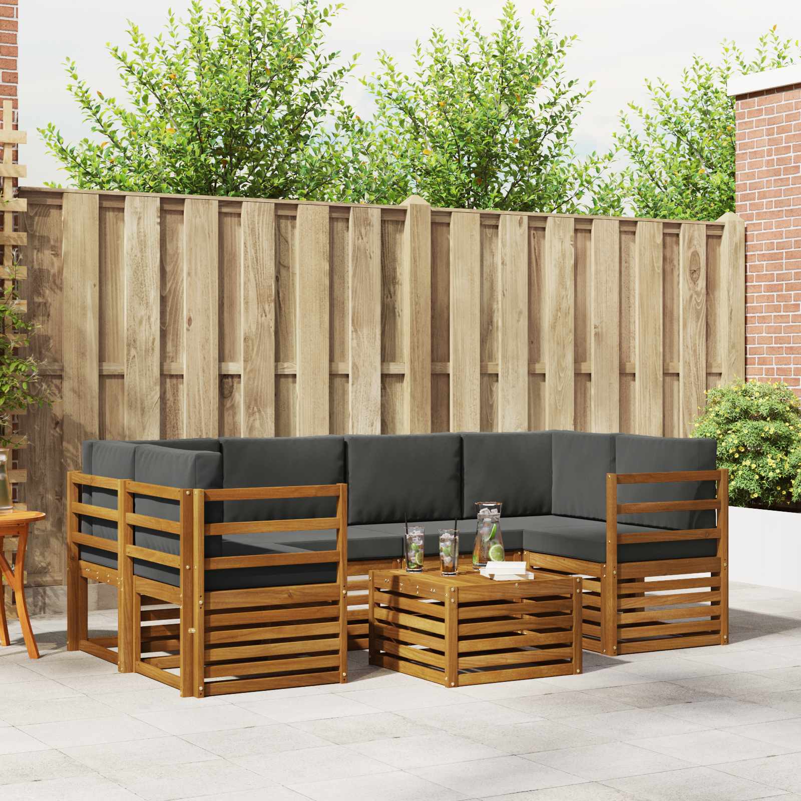 Das Outdoor-Möbelset verbindet Stil und Funktionalität und wird so zum Blickfang in jedem Garten oder auf jeder Terrasse. Das moderne Design mit klaren Linien und minimalistischen Details bietet Eleganz und lädt zum Entspannen und Verweilen ein. Hergestellt aus solidem Akazienholz, ist es langlebig und sieht lange gut aus – die beste Wahl für alle, die ein praktisches und ansprechendes Design für ihre Outdoor-Möbel suchen. Hochwertiges Akazienholz: Hergestellt aus solidem Akazienholz ist dieses Outdoor-Möbelset langlebig und weicht nicht leicht. Die stabile Konstruktion sorgt für verlässliche Unterstützung und bleibt über Jahre hinweg top, während der warme Farbton deinem Garten mehr Flair verleiht. Wetterbeständige Oberfläche: Die lackierte Oberfläche bietet zusätzlichen Schutz vor Sonne, leichtem Regen und anderen Witterungsbedingungen. So bleibt das schöne Aussehen und die Funktionalität erhalten, damit du lange Freude daran hast. Durchdachtes Design: Jedes Element, von den Armlehnen zur Rückenlehne, ist sowohl stilvoll als auch funktional. Unterstützende Features sorgen für extra Komfort und ein harmonisches Gesamtbild, das gut zu vielen Anlässen passt. Komfort im Freien: Das modulare Design erlaubt dir flexible Anordnungen, die perfekt auf deine Platz- und Bedarfsanforderungen angepasst werden können. Optimal für Entspannung, gesellige Runden oder ruhige Lesemomente, passt sich dieses Set problemlos jeder Umgebung an und sorgt für maximalen Komfort. Einfache Pflege: Halte deine Möbel in Topform, indem du die Oberfläche mit einem feuchten Tuch abwischst. Verzichte besser auf aggressive Reinigungsmittel. Regelmäßiges Putzen hilft dir, das schöne Aussehen zu bewahren und die Lebensdauer der Möbel zu verlängern.