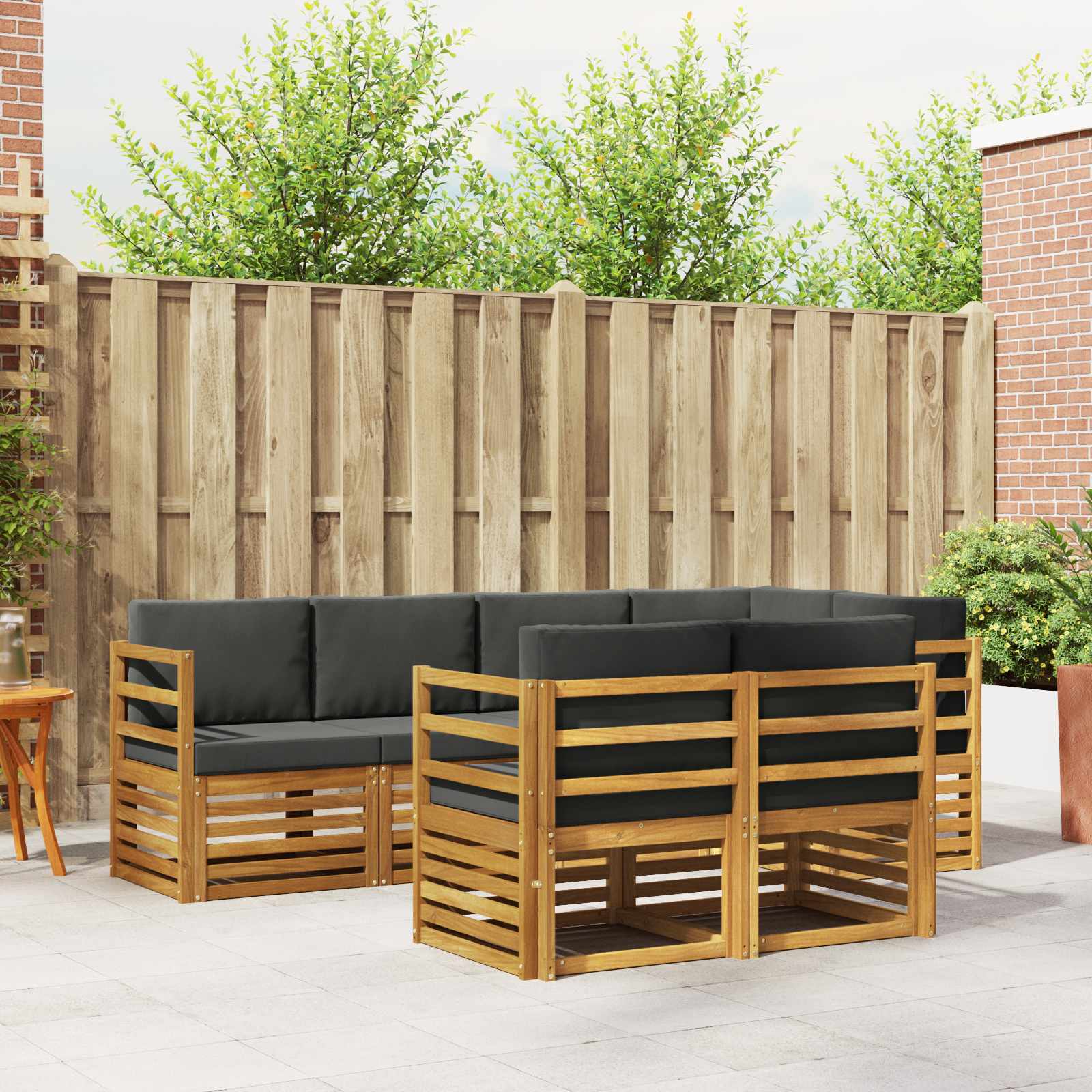 Das Outdoorsofaset kombiniert Stil und Funktionalität und wird zum coolen Mittelpunkt für jeden Garten oder jede Terrasse. Mit klaren Linien und schlichtem Design bringt es Eleganz und macht das Entspannen und gesellige Beisammensein im Freien noch schöner. Vollständig aus massivem Akazienholz gefertigt, steht es für Haltbarkeit und sieht dabei einfach gut aus – die perfekte Wahl für alle, die Praktikabilität und modernes Design bei Gartenmöbeln suchen. Robustes Massivholz Akazie: Dieses Outdoor-Möbelset aus massivem Akazienholz ist bekannt für seine Langlebigkeit und Widerstandskraft. Die stabile Bauweise bietet zuverlässigen Halt und bleibt langfristig stabil, während die warmen Holztöne deinen Garten oder deine Terrasse aufwerten. Wetterbeständiges Design: Dieses Outdoor-Möbelset hat eine lackierte Oberfläche, die einen zusätzlichen Schutz gegen Sonnenstrahlen, leichten Regen und andere Witterungseinflüsse bietet. Die glatte Oberfläche hilft, das Aussehen und die Funktion zu erhalten, sodass es langlebig bleibt für deinen Garten, deine Terrasse oder deinen Hinterhof. Komponenten & Design: Jedes Teil – von den Armlehnen bis zu den Rückenlehnen – wurde für Stil und Funktion entwickelt. Unterstützende Details sorgen für mehr Komfort, während das harmonische Design ein stimmiges Gesamtbild schafft, das perfekt für verschiedene Outdoor-Anlässe ist. Komfort & Vielseitigkeit: Dank des modularen Designs kannst du die Anordnung flexibel gestalten, sodass sie zu unterschiedlichen Räumen und Bedürfnissen passt. Ob beim Chillen, Feiern oder Lesen – dieses Set macht in jeder Außenszenerie eine gute Figur und sorgt für maximalen Komfort. Einfache Pflege & Wartung: Halte die Möbel gut in Schuss, indem du die Oberfläche mit einem feuchten Tuch abwischst und aggressive Reinigungsmittel meidest. Regelmäßige Pflege trägt dazu bei, dass sie gut aussieht und die Lebensdauer verlängert.