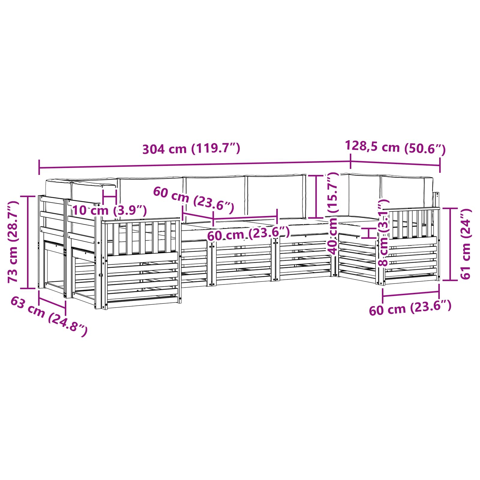- 7 x Sitzkissen: 60 x 60 x 8 cm (LxBxH)