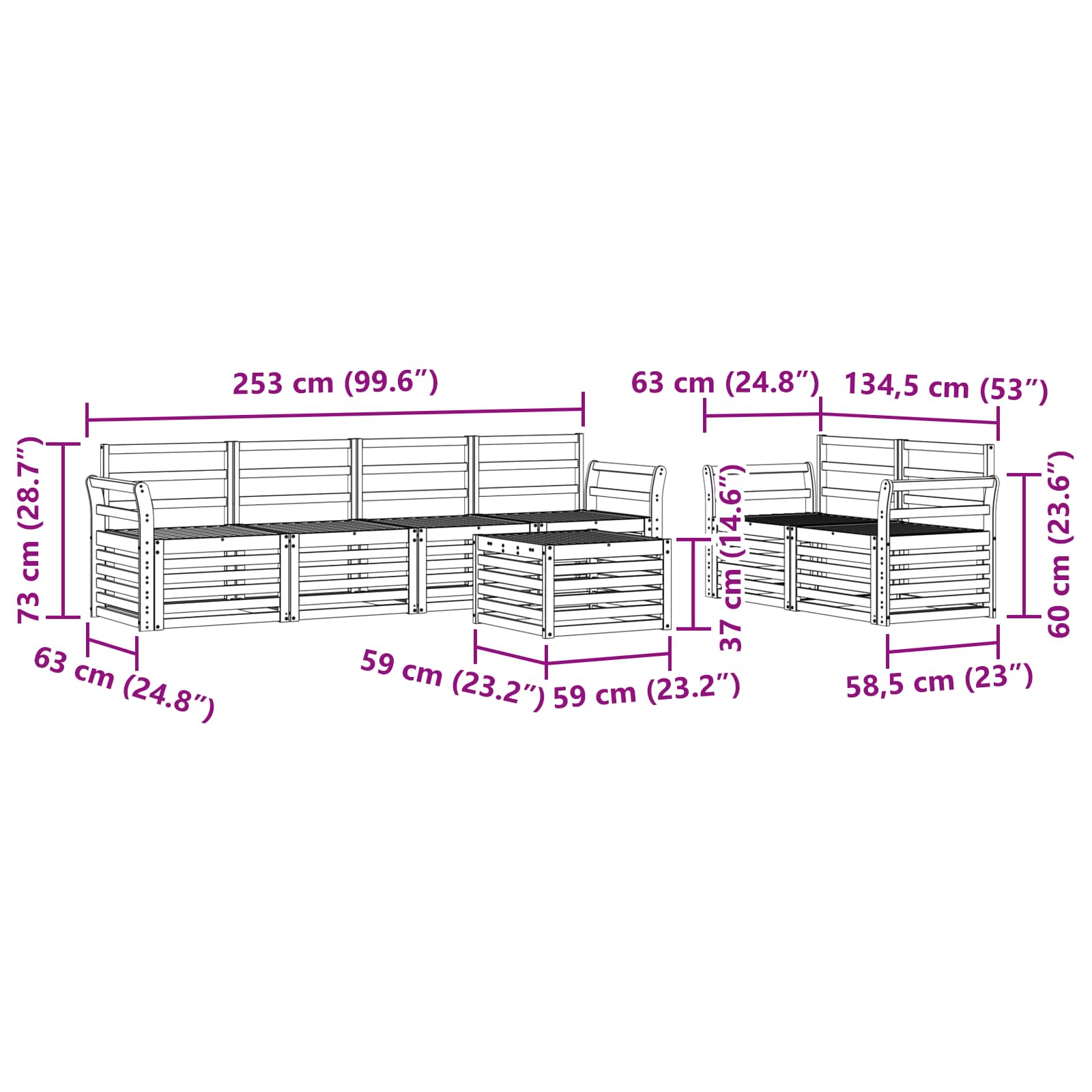 - 6 x Mittelsofa: 63 x 59 x 73 cm (LxBxH)