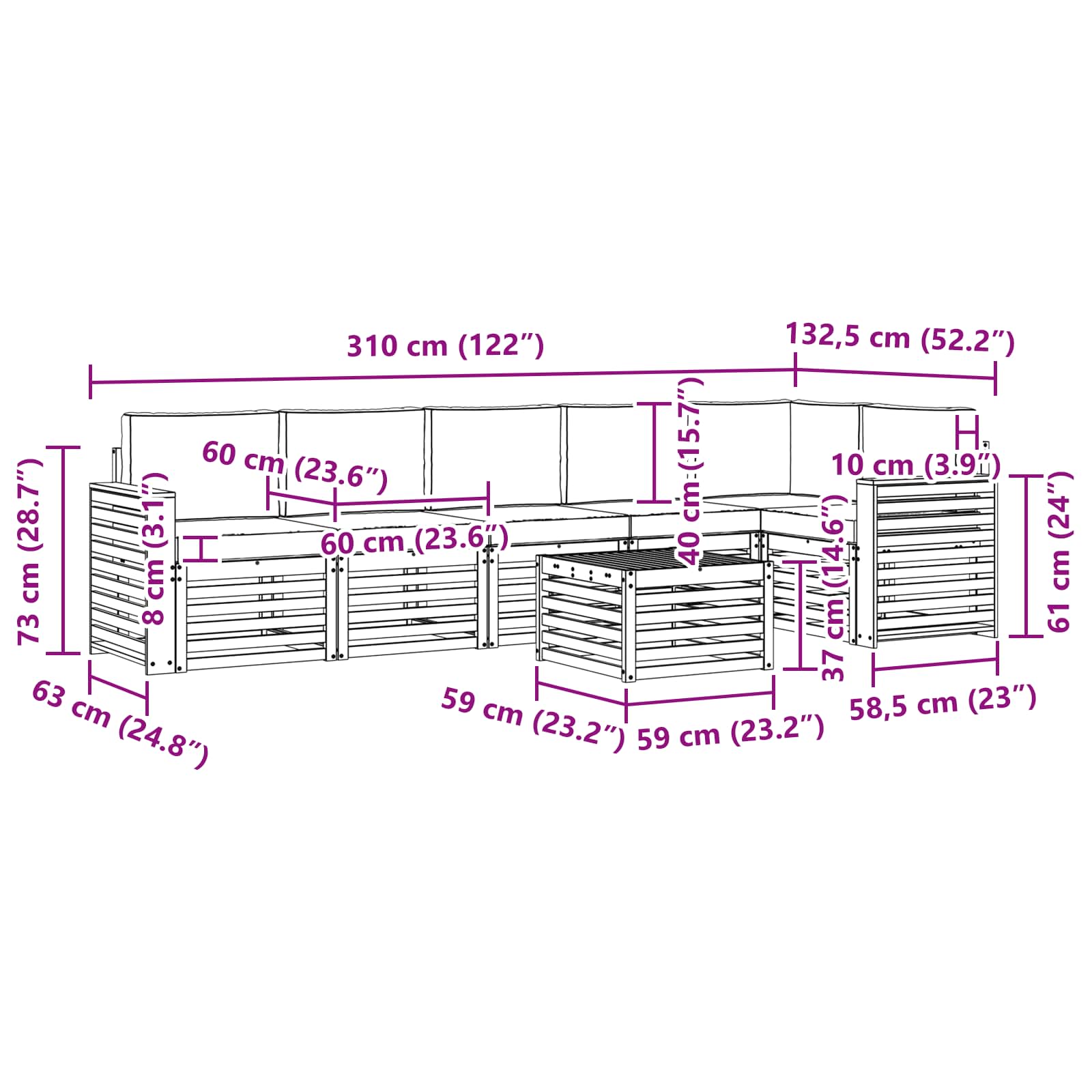 - 7 x Rückenlehne: 60 x 40 x 10 cm (LxBxH)
