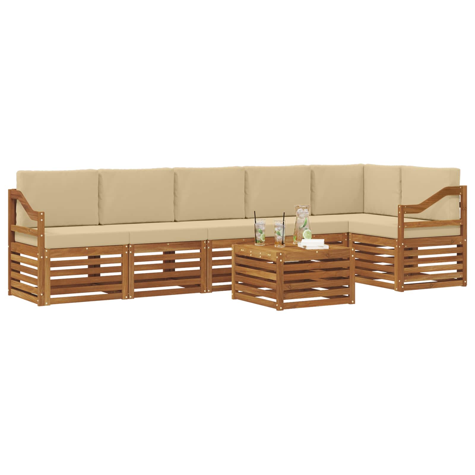 Dieses schicke Outdoor-Sofaset aus solidem Akazienholz ist der Inbegriff von Stil und Langlebigkeit. Es eignet sich klasse für Gärten, Terrassen und Poolbereiche. Mit seinem modernen, schlanken Design kannst du die Möbel ganz nach deinen Wünschen anordnen. Erschaffe eine entspannende und freundliche Atmosphäre mit den warmen Brauntönen, die sich super in die natürliche Umgebung einfügen – ideal für chillige Nachmittage oder gesellige Treffen. Materialien: Hergestellt aus solidem Akazienholz, zeigt dieses Set die natürliche Holzmaserung und hat eine tolle braune Oberflächenbehandlung. Akazienholz ist bekannt für seine Langlebigkeit und Wetterfestigkeit, damit es immer gut aussieht, egal bei welchem Wetter. Enthaltene Komponenten: Genieß den besonderen Komfort mit den massiven Akazienholz-Armliegen und -Sitzen, die nicht nur toll aussehen, sondern auch super bequem sind. Jedes Teil passt perfekt ins Gesamtbild und sorgt für ein entspanntes Sitzen. Eigenschaften / Funktion / Design: Mit einer lamellenförmigen Fläche für eine gute Luftzirkulation und um Wasseransammlungen zu vermeiden, bleibt dieses Set funktional und sieht dabei auch noch richtig gut aus. Der moderne Stil ist einfach und passt perfekt zu zeitgenössischen Außenbereichen und bietet sowohl Form als auch Funktion. Empfohlene Verwendungen: Perfekt für Garten-, Patio- oder Poolbereich, das Set deckt deine Unterhaltung und Entspannung bestens ab. Das flexible Design ermöglicht dir, die Möbel ganz nach Bedarf zu arrangieren – ideal für Treffen mit Freunden oder ruhige Rückzüge. Pflege & Wartung: Halte es in Top-Zustand mit einfacher Pflege – wisch einfach regelmäßig mit einem feuchten Tuch drüber, um Staub und Schmutz zu entfernen. So sorgt es immer für einladende und gemütliche Stimmung.