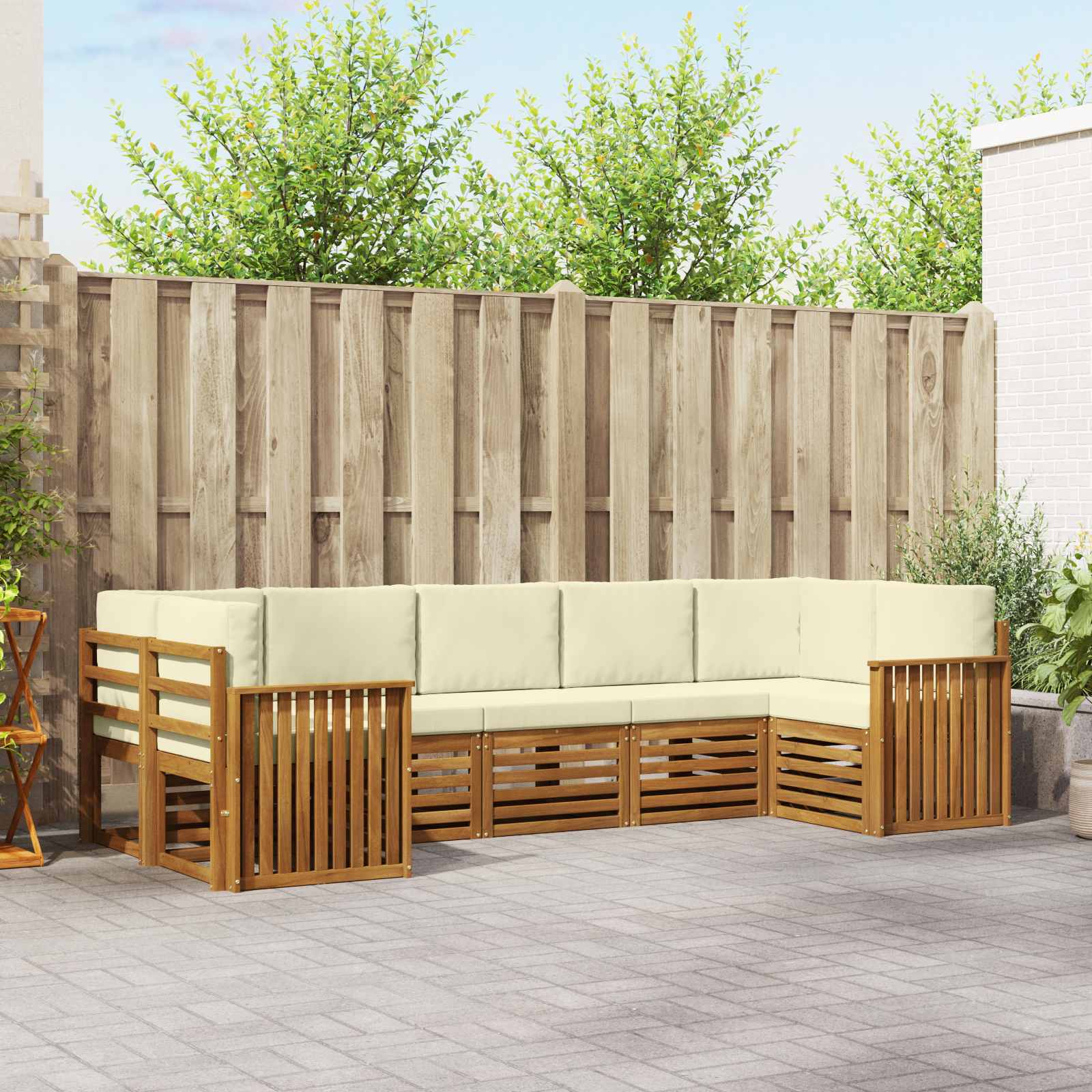Dieses Outdoor-Sektionalsofa-Set überzeugt mit einem stylischen und funktionalen Design, das perfekt in deinen Garten, auf die Terrasse oder an den Pool passt. Aus solidem Akazienholz gefertigt, bringt es natürlichen Charme in jeden Außenraum. Es ist modular aufgebaut, sodass du es für jeden Anlass anpassen kannst. Der Komfort ist garantiert – perfekt für entspannte Nachmittage oder gesellige Abende. Hochwertige Materialien Dieses Garten-Sofa-Set aus solidem Akazienholz bringt Eleganz in jeden Außenbereich. Akazienholz ist stabil, witterungsbeständig und bleibt über die Jahreszeiten hinweg in top Zustand. Flexible modulare Bauweise Das modulare Design des Sets erlaubt es dir, die Möbel ganz nach deinen Vorlieben anzuordnen. Egal, ob du eine coole Ecklösung oder einen großzügigen Sitzbereich willst, es passt immer perfekt! Funktionale Komponenten Die Armlehnen sorgen für zusätzlichen Komfort und entspannen richtig gut. Das schlichte Latten-Design ergänzt die Holzstruktur und sieht super aus. Moderne Ästhetik Die klaren Linien und die minimalistische Gestaltung spiegeln modernes Design wider. Es ist die perfekte Leinwand für deinen eigenen Style und harmoniert gut mit vorhandenen Gartenmöbeln. Niedriger Pflegeaufwand Pflegeleichten ist hier kein Problem. Mit einem feuchten Tuch gewischst und es sieht aus wie neu. Akazienholz widersteht Flecken und Schmutz, bleibt also ein toller Bestandteil deines Außenbereichs.