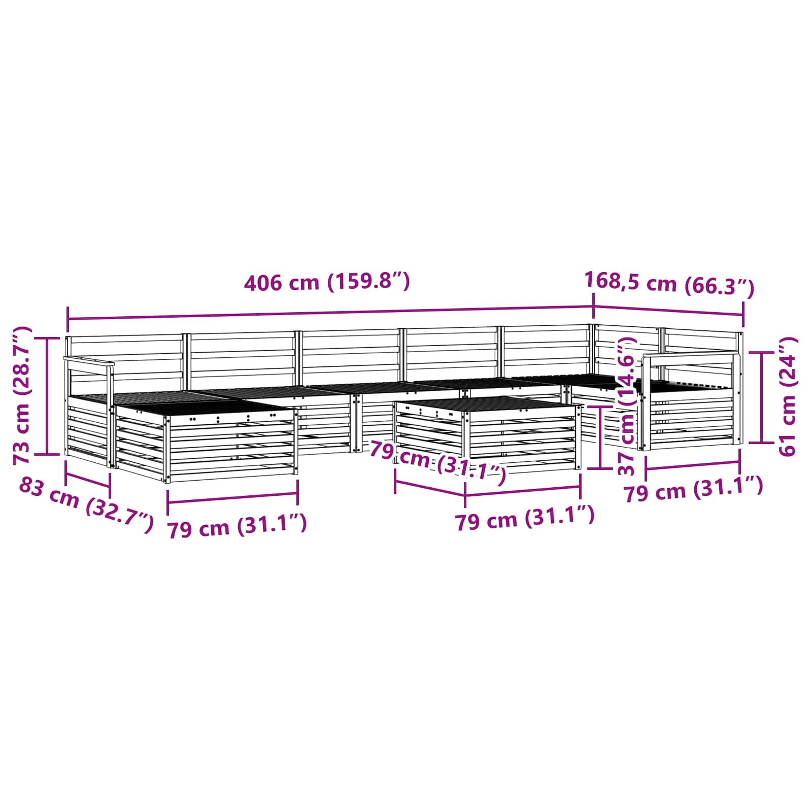 - Gesamtabmessungen: 406 x 168,5 x 73 cm (L x B x H)