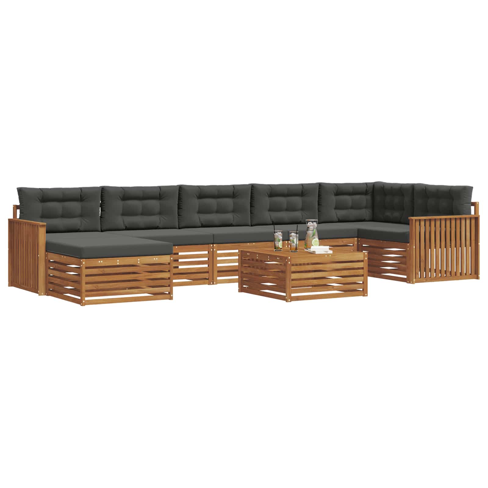 Mit diesem Outdoormöbel-Set verwandelst du deinen Garten, deine Terrasse, deinen Poolbereich oder deinen Hinterhof in eine praktische und einladende Oase. Das Sofa-Set im modernen Look bietet klare Linien und funktionale Designelemente, die sich perfekt in jede Außenumgebung einfügen. Es ist der ideale Ort zum Entspannen oder um Gäste zu bewirten. Seine harmonische Kombination aus natürlichen Holzfarbtönen und robuster Bauweise macht es sowohl stylisch als auch praktisch. Qualitätshandwerk: Hergestellt aus solidem Akazienholz, hat dieses Sofa-Set einen natürlichen, warmen Braunton, der Eleganz und Wohlfühl-Atmosphäre ausstrahlt. Das Material ist langlebig, wetterbeständig und perfekt für den Einsatz im Freien. Akazienholz ist widerstandsfähig und sorgt dafür, dass das Set auch nach vielen Saisons toll aussieht. Integrierte Flexibilität: Das modulare Design lässt dir die Freiheit, die Teile je nach Bedarf umzustellen. Ob für eine große Feier oder eine heimelige Ecke für ruhige Abende, das Set kann einfach neu angeordnet werden und erhöht die Flexibilität für jedes Außenumfeld. Stylische Praktikabilität: Das Sofa kombiniert einen Lattenrücken mit einem stabilen Rahmen und balanciert so Stil und Komfort. Die minimalistischen Armlehnen und die klaren Oberflächen geben dem Sofa ein modernes Aussehen, sodass es perfekt in zeitgemäße Außenbereiche passt. Die schlanken Linien verstärken die visuelle Anziehung und sorgen für ein bequemes Sitzgefühl. Komplementäre Komponenten: Das Sofa hat essentielle Teile wie einen Lattenrücken und robuste Armlehnen aus solidem Akazienholz, die für Qualität und Stabilität stehen. Es bietet Platz für verschiedene Kissen, die den Komfort steigern, ohne das cleane Design zu stören. Pflege und Wartung: Das Set ist praktisch in der Pflege, es braucht nur ein einfaches Abwischen mit einem feuchten Tuch, um gut auszusehen. Mit regelmäßiger Pflege bleibt es langlebig und behält seine Anziehungskraft, und das macht es zur perfekten Wahl für jeden Außenbereich.