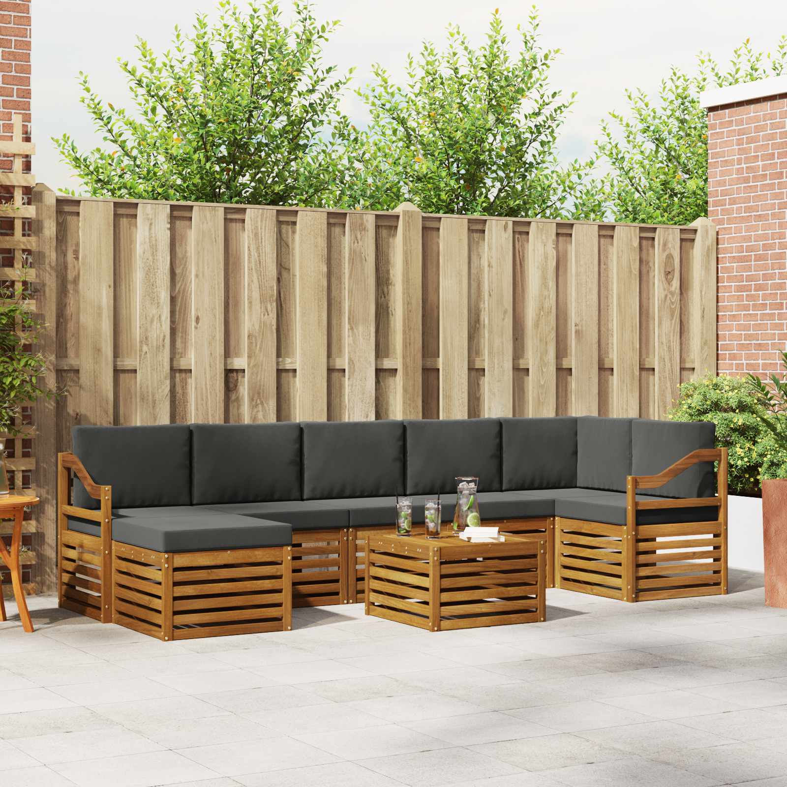 Das Outdoor-Möbelset bringt Stil und Funktion zusammen und ist ein echtes Highlight für jeden Garten oder jede Terrasse. Das moderne Design mit klaren Linien und minimalistischen Details verleiht deinem Außenbereich Eleganz und schafft gleichzeitig eine gemütliche Atmosphäre für Entspannung und gesellige Zusammenkünfte. Hergestellt aus massivem Akazienholz, garantiert das Set Langlebigkeit und bleibt optisch ansprechend – die perfekte Wahl für all jene, die praktische und schicke Gartenmöbel suchen. Robustes Massivholz Akazie: Dieses Outdoor-Möbelset aus massivem Akazienholz ist langlebig und widerstandsfähig gegen Witterungseinflüsse. Es sorgt für Stabilität und ist eine Bereicherung für jeden Garten oder jede Terasse. Wetterfeste Verarbeitung: Mit einer lackierten Oberfläche bietet das Set zusätzlichen Schutz vor Sonne, leichtem Regen und anderen Witterungsbedingungen. Der glänzende Look bleibt erhalten und sorgt dafür, dass die Möbel deine Terrasse oder deinen Garten optimal ergänzen. Stylisches Design: Jedes Element, von den Armlehnen bis zu den Rückenlehnen, ist sowohl stylisch als auch funktional gestaltet. Unterstützende Features sorgen für zusätzlichen Komfort, während das harmonische Design ein einladendes Gesamtbild für verschiedene Outdoor-Anlässe schafft. Komfort & Flexibilität: Das modulare Design ermöglicht dir, die Möbel nach Bedarf umzustellen. Perfekt zum Entspannen oder für gesellige Treffen – dieses Set passt sich jeder Outdoor-Situation an und maximiert den Komfort. Einfache Pflege: Um die Möbel gut in Schuss zu halten, wisch einfach mit einem feuchten Tuch über die Oberfläche und vermeide aggressive Reinigungsmittel. Regelmäßige Pflege hilft dabei, ihr Aussehen zu bewahren und die Lebensdauer der Möbel zu verlängern.